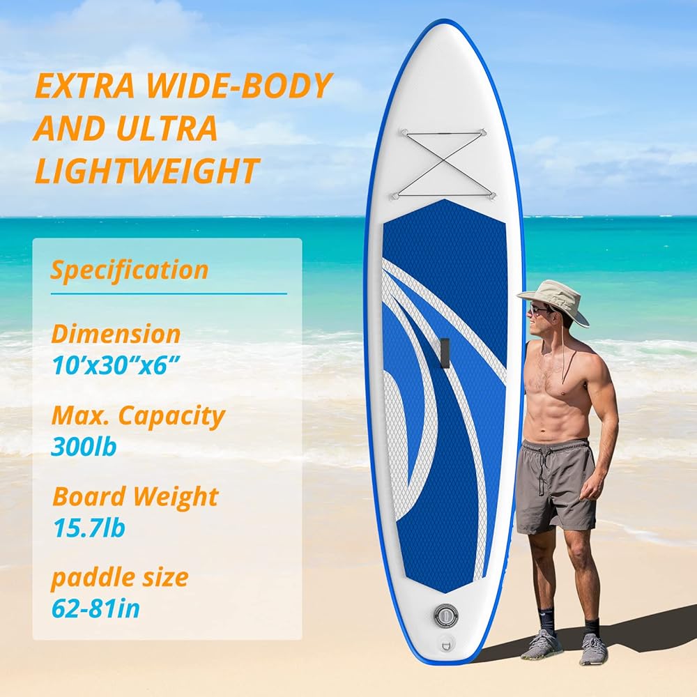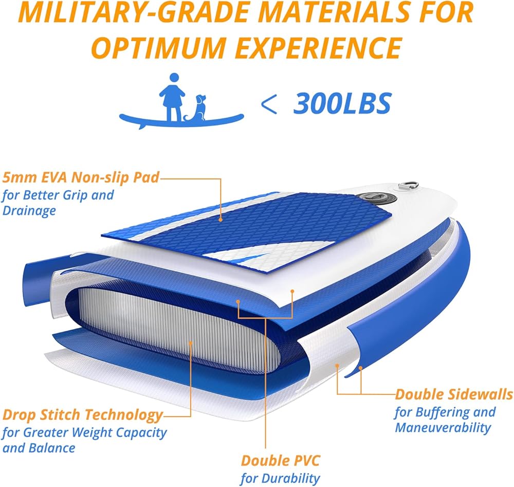 • Ultra Light & Portable: The iSUP is made of military-grade double PVC with a drop-stitch core, gives board enough cushioning. Weight limit up to 300lbs but 15.7lbs (30% lighter than others) weight allows people who are not strong to lift it easily.