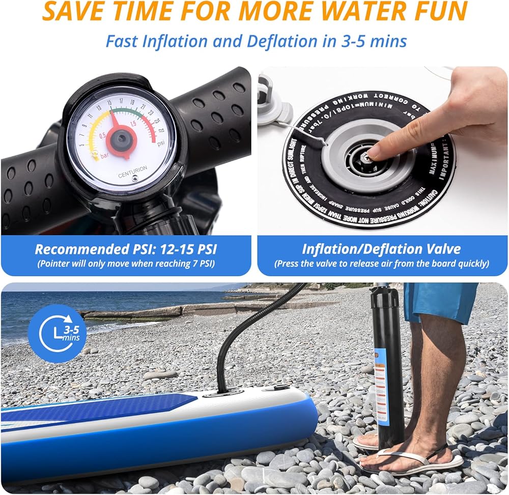 • Fast Inflation & Deflation: Equipped with a double-action hand pump with gauge, helping you to inflate paddleboard within 5 minutes! (30% faster than others) After 5-8 minute deflation, the blow up board can be folded into a portable size.