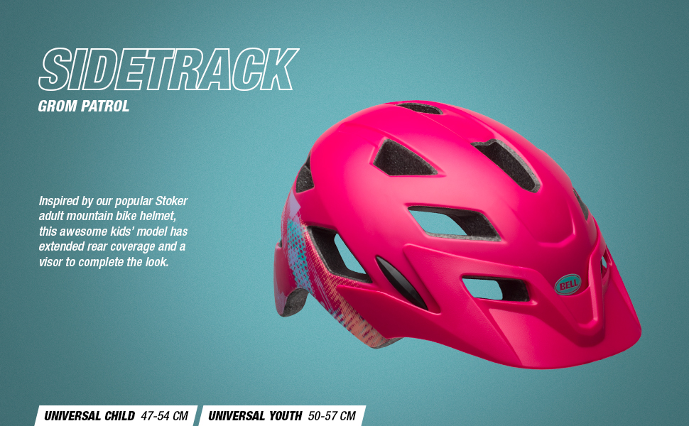 GROM PATROL. Inspired by our popular Stoker adult mountain bike helmet, this awesome kids' model has extended rear coverage and a visor to complete the look. Kids these days. They love to ride, sometimes fearlessly, and they have more trails, bike parks and fun places to shred. We designed the Sidetrack kids bike helmet to keep up with them. The Sidetrack features our all-mountain shape with lower coverage on the rear of the head. The ready-for-action style, complete with a cool visor, gets young riders motivated to ride. And the new Ergo-Fit system makes it quick and easy to get them going.