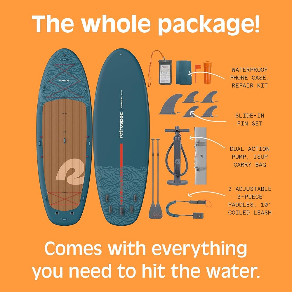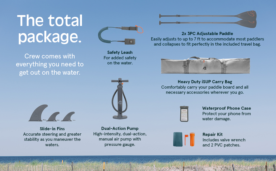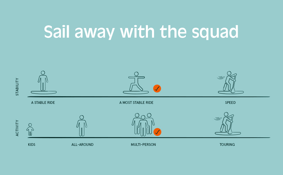 كل ما تحتاجه - يأتي لوح التزلج متعدد الأشخاص الخاص بنا مع كل ما تحتاجه لقضاء يوم ممتع على الماء مع العائلة والأصدقاء. تشتمل على: مضخة مزدوجة العمل، وحقيبة ظهر، ومجدافين قابلين للتعديل من 3 قطع، وزعانف قابلة للإزالة، ومجموعة إصلاح، ومقود أمان، وحافظة هاتف مقاومة للماء.
