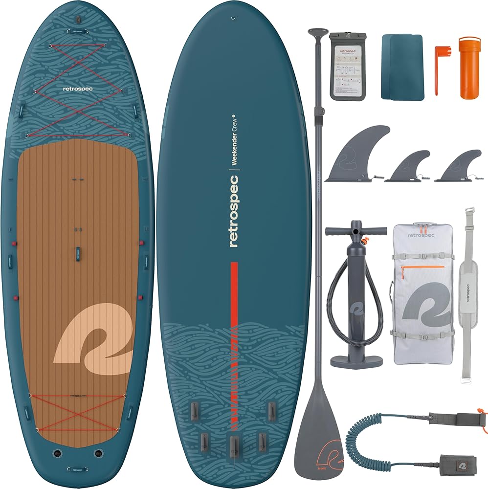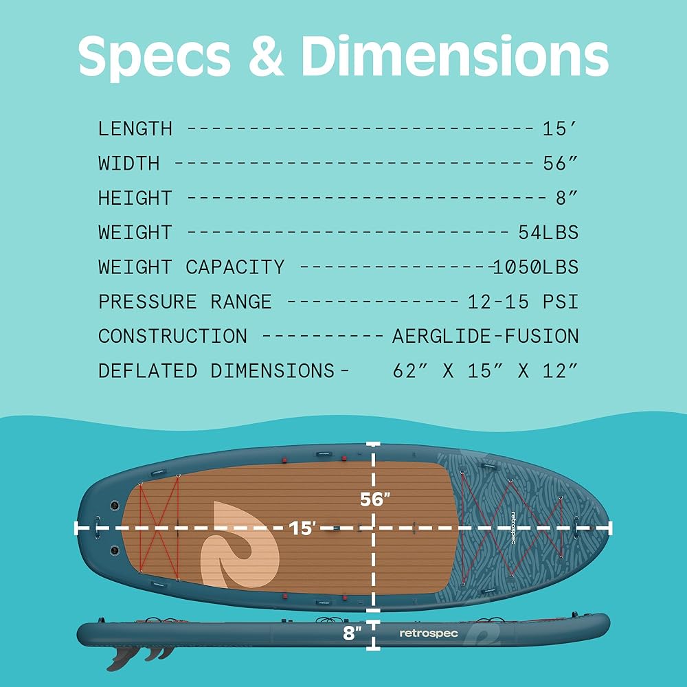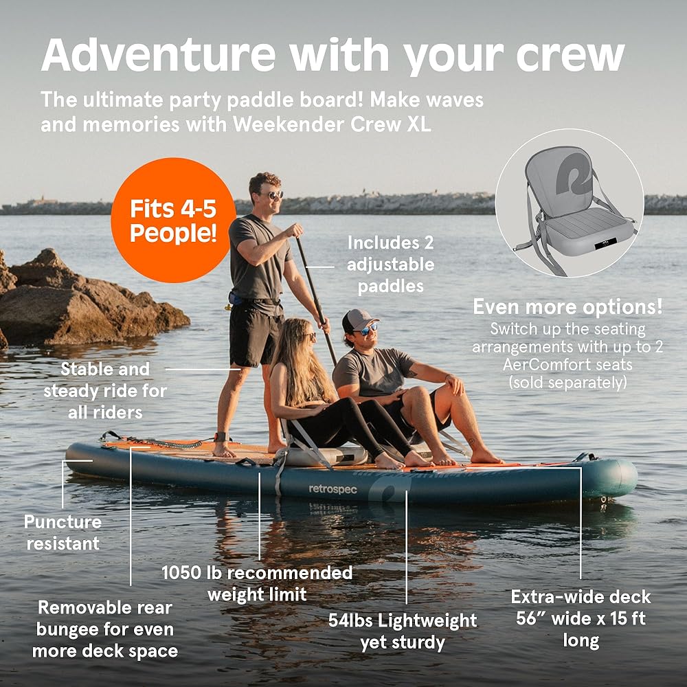 شارك المغامرة - لوح التجديف المثالي القابل للنفخ للطاقم بأكمله! يبلغ عرض لوح التجديف 56 بوصة وطوله 15 قدمًا، ويتميز بسطح واسع للغاية يتسع لما يصل إلى 5 راكبين وحتى جرو مغامر! قم بالتجديف جنبًا إلى جنب أو الطفو أو الساحل أو الصيد لمغامرة جماعية لا تُنسى. يضمن تصميم Crew XL المتين والمستقر للغاية قيادة متوازنة وسلسة للجميع.