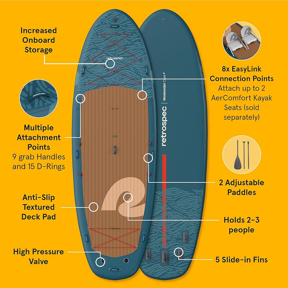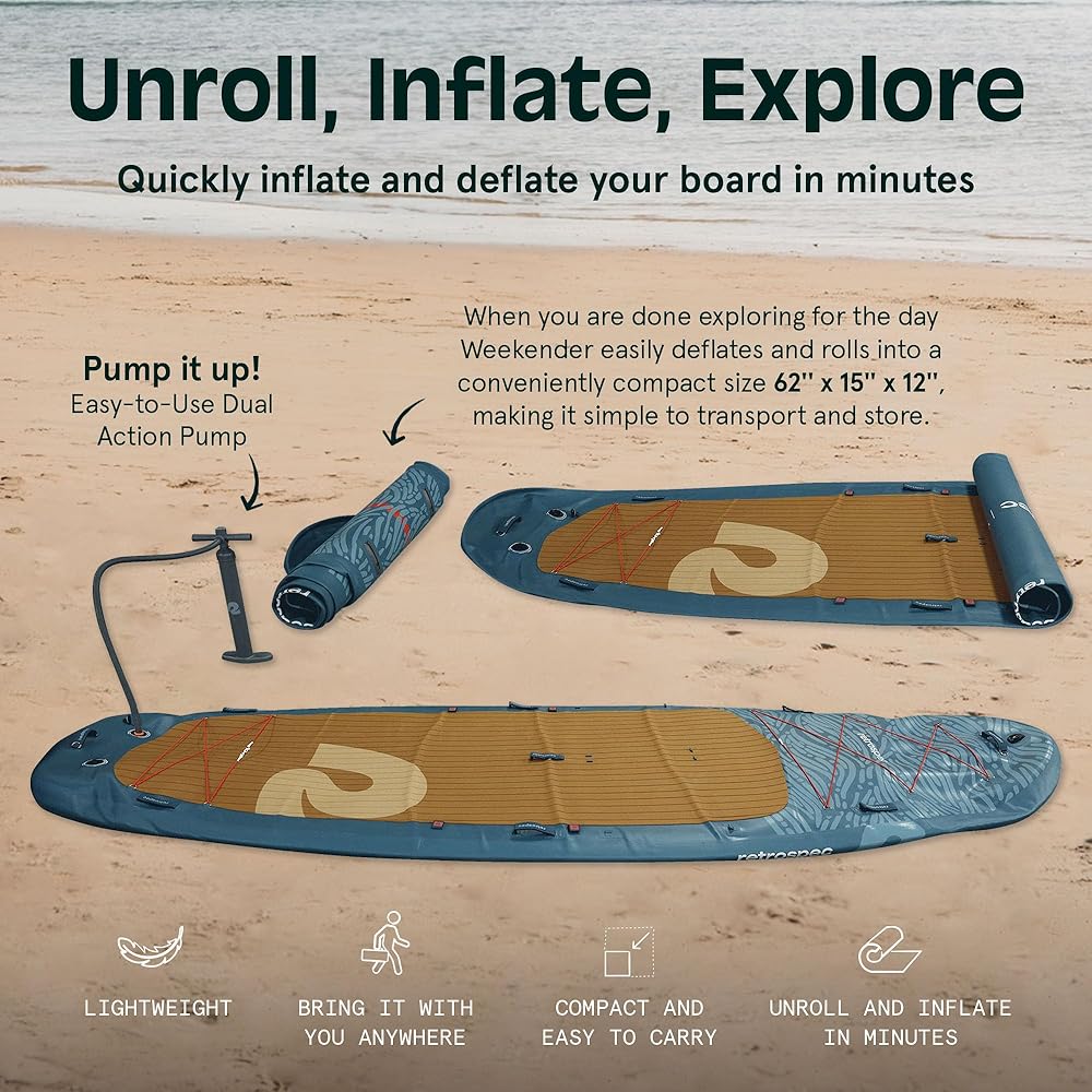صغير الحجم وقابل للحمل - بوزن 54 رطلاً فقط، يتميز لوح التجديف القابل للنفخ متعدد الأشخاص بأنه خفيف الوزن وقابل للحمل مما يسمح لك بإحضاره معك بسهولة في أي مكان. عند الانتهاء من اليوم، يتم تفريغ اللوح القابل للنفخ بسهولة ولفه في حجم صغير (62 × 15 × 12 بوصة) لسهولة التخزين.