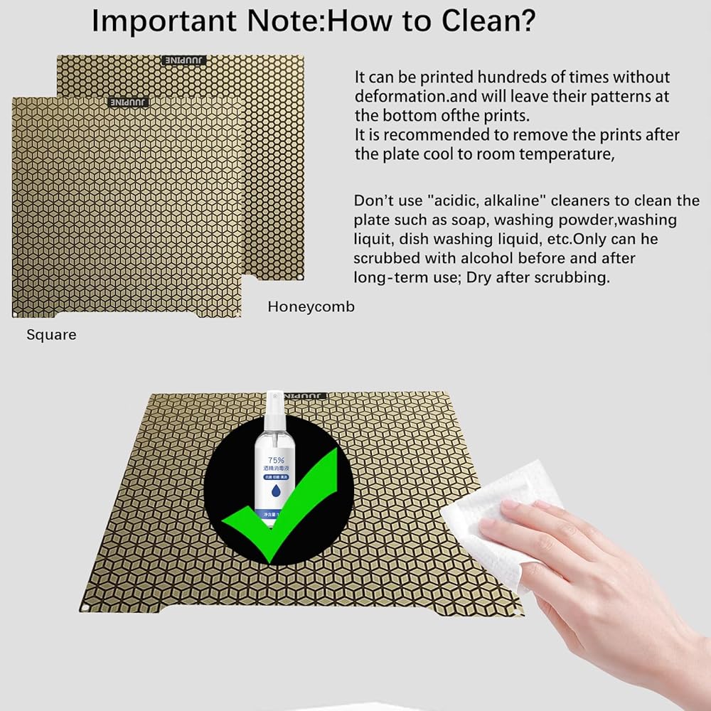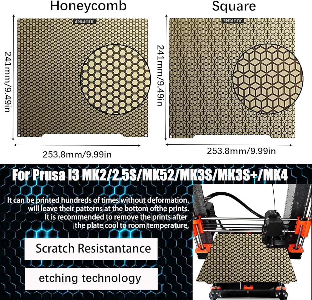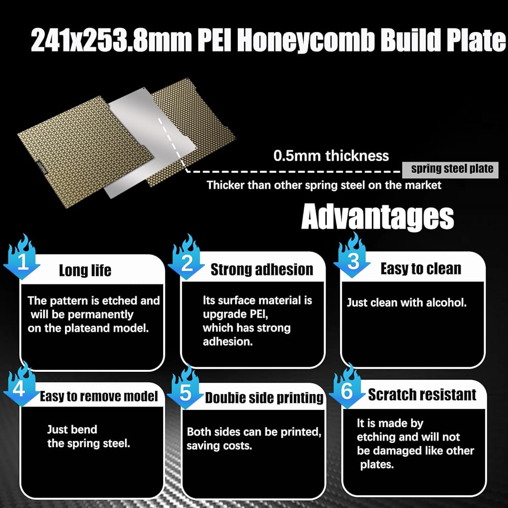 【 Precautions and Cleaning Methods 】This double-sided texture PEI Honeycomb build plate is suitable for 3D printers with a platform size of 241x253.8mm, compatible with Prusa i3 mk3s, MK2,MK2.5S, MK52, MK3S, MK4, MK4S and other models. Please confirm your printer type before purchasing. Special reminder: Do not use "acidic or alkaline" cleaning agents (such as soap, laundry detergent, laundry detergent, dishwashing liquid, etc.) for cleaning. Simply wipe with alcohol before and after long-term use, and wipe dry.