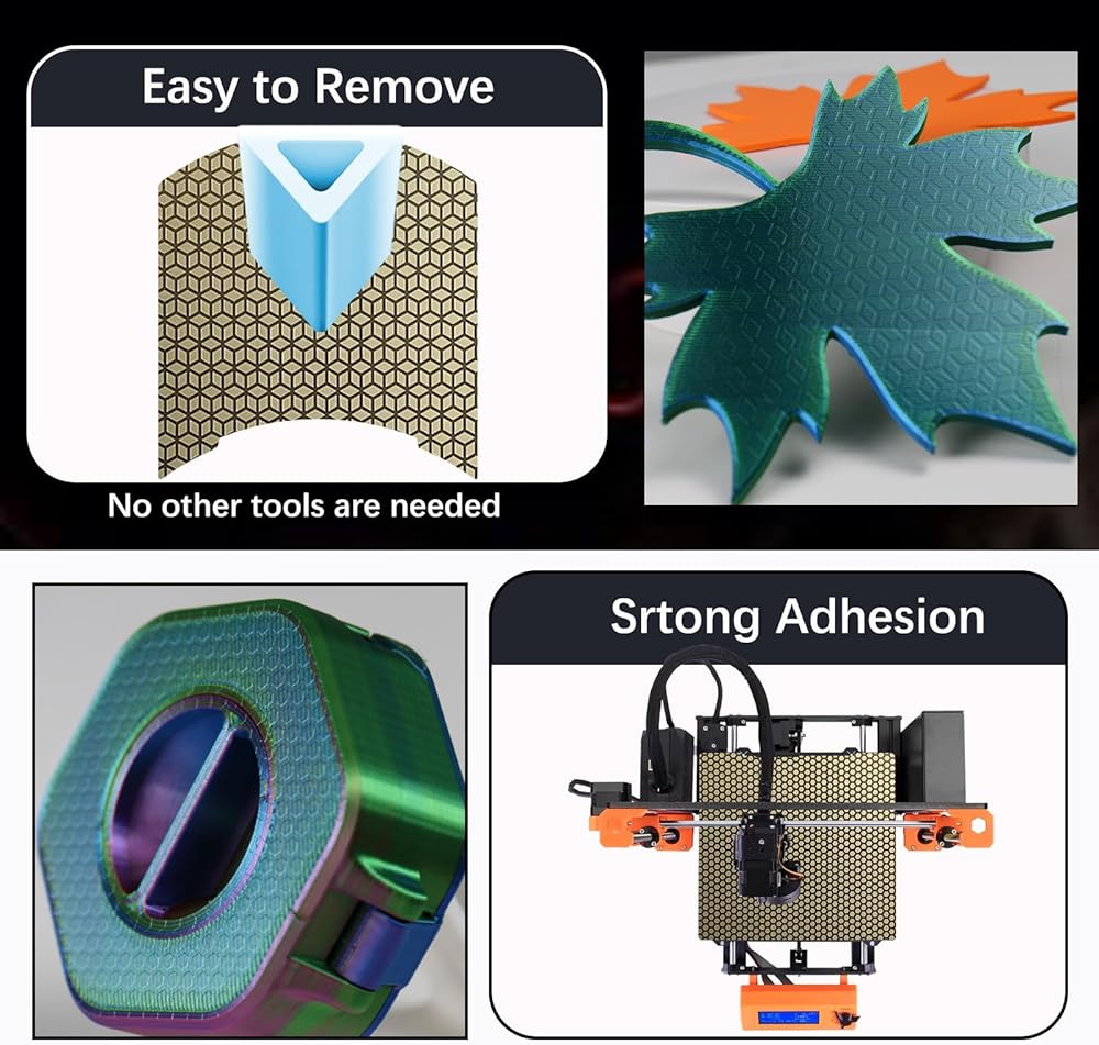 【Excellent adhesion of first layer printing】The model can firmly adhere to the surface of the printing bed, making it easy for even beginners to print. Compared to traditional smooth holographic build plates, it has a longer service life, no need to worry about film detachment, excellent adhesion performance, and no need for additional coating. Please make sure to cool the plate surface before removing the model to avoid damaging the coating.
