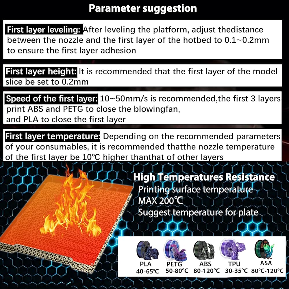 【High temperature tolerance】PEI honeycomb build plate can withstand high temperatures up to 200 ° C. Please clean the printing build plate before each use to ensure optimal adhesion. We provide recommended temperatures for different filaments: TPU: 30-35 ° C;PLA: 40-65°C;PETG: 50-80°C; ABS: 80-120°C; ASA: 80-120 ° C. Users can adjust according to their actual printing needs.