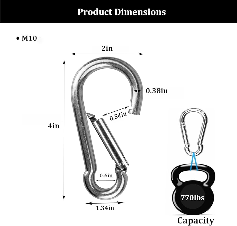 • 【2 Inch Spring Snap Hook Carabiner】: The M5 safety snap hook is 1.96 x 0.94 inch; Hold capacity: 176lbs; Large heavy-duty carabiner clip with 2-inch full length for chain, wire, rope, and slings, perfect accessory for outdoor activities.