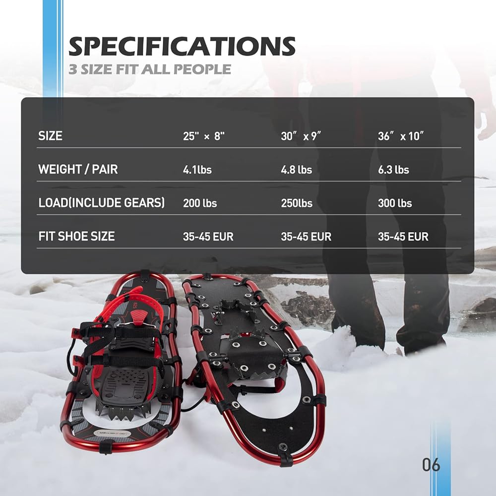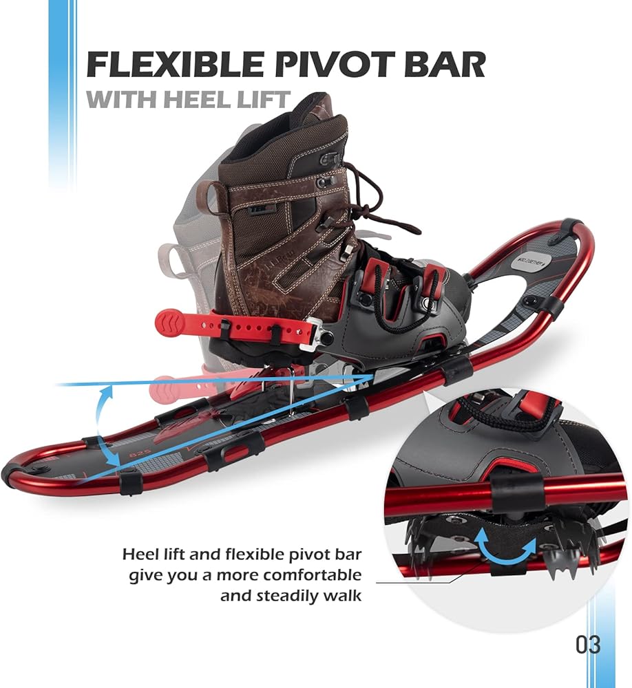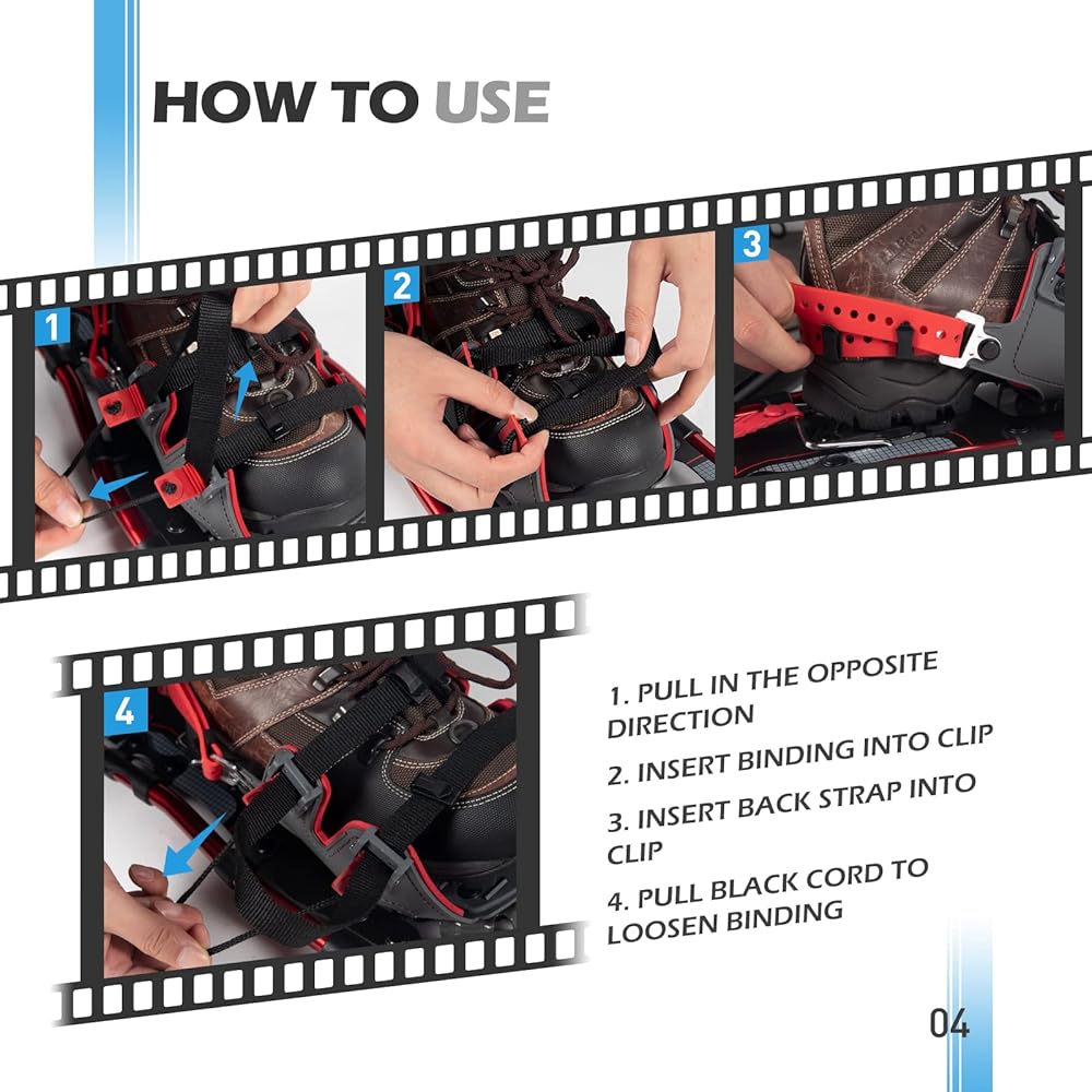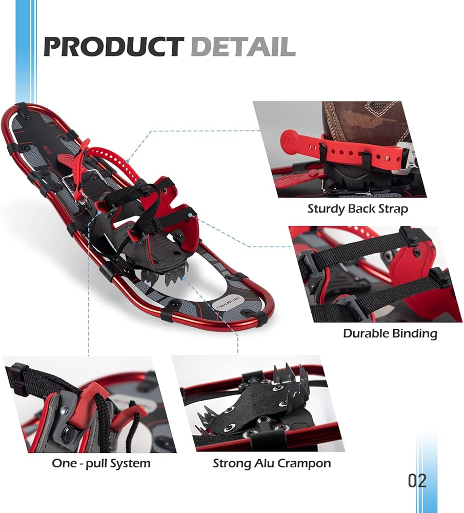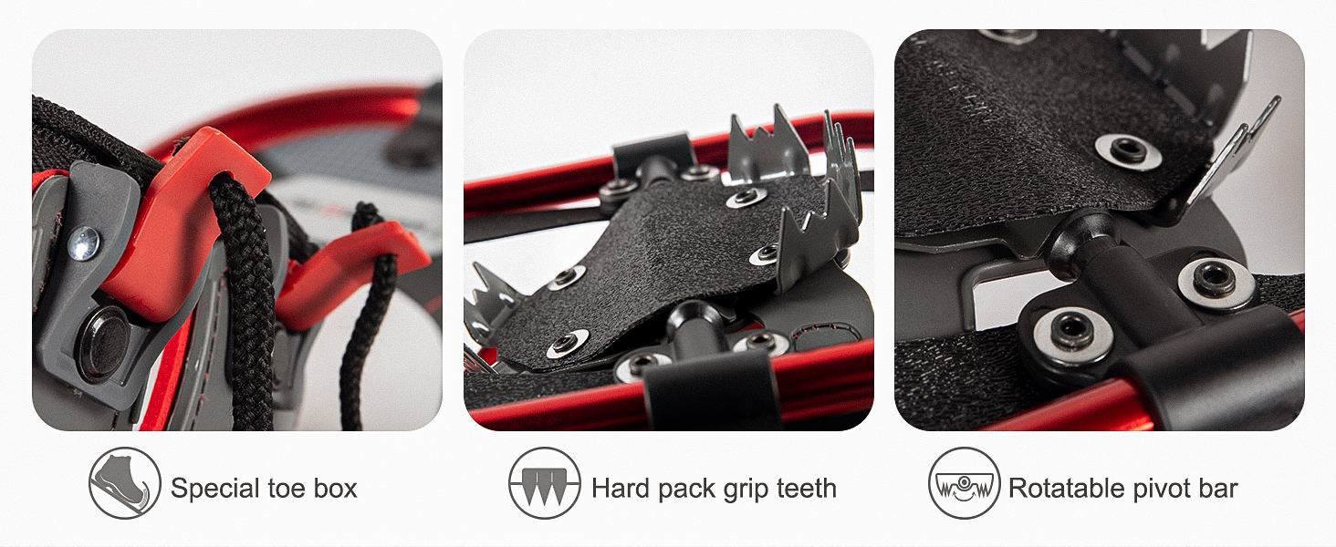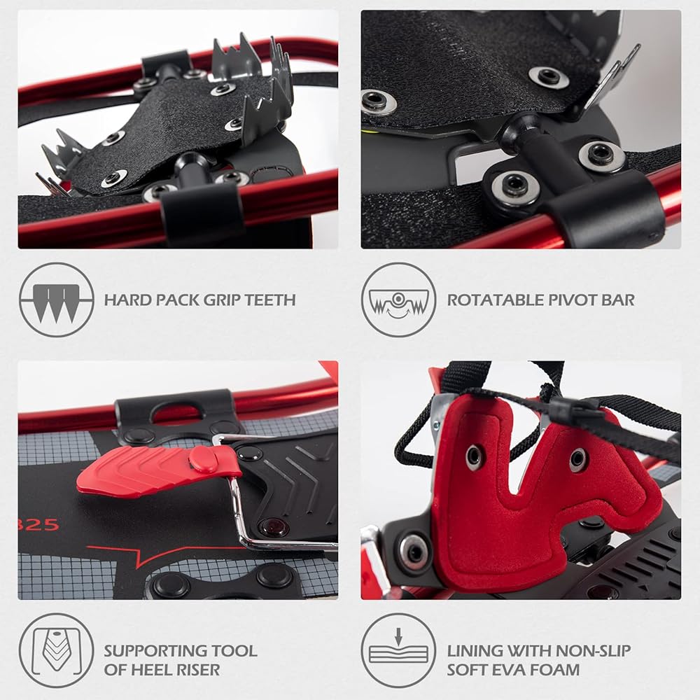 ❄【مادة قوية】- تستخدم أحذية الثلوج G2 مادة HDPE عالية الجودة وخفيفة الوزن كسطح لتوفير طفو لطيف في حقل الثلج حتى يتمكن المستخدمون من توفير طاقتهم والذهاب أبعد من ذلك.