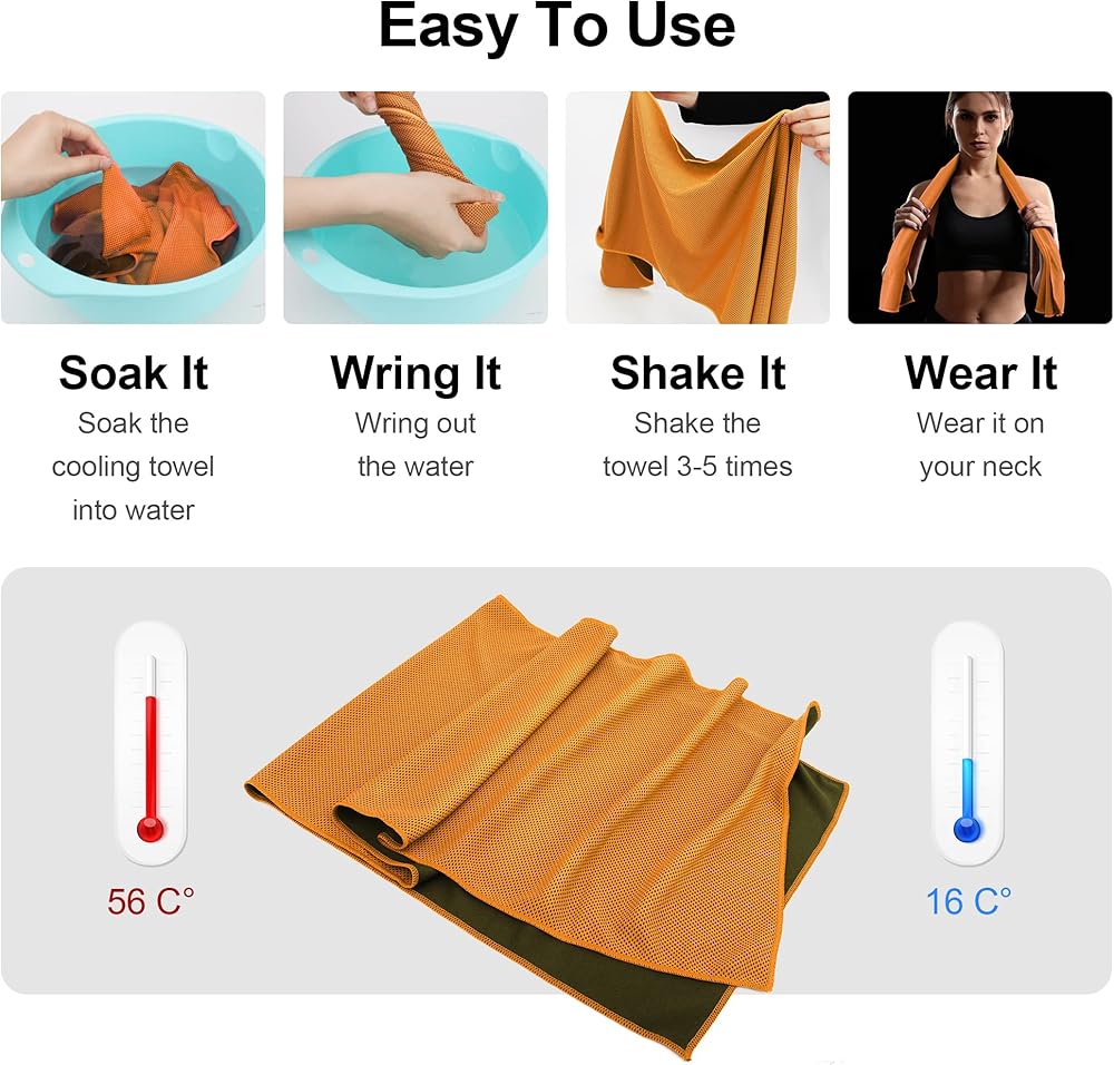 تقنية التبريد السريع لبرودة دائمة: استمتع بالراحة الفورية مع منشفة التبريد الخاصة بنا التي تعمل على تنشيط برودة الجسم في ثوانٍ. ما عليك سوى نقعها، ثم عصرها، ثم فتحها لفتح واحة التبريد التي تبقيك منتعشًا لمدة تصل إلى ثلاث ساعات. مثالية لأيام الطقس الحار، مما يتيح لك إعادة إشعال البرودة بسرعة بنفس الخطوات السهلة.
