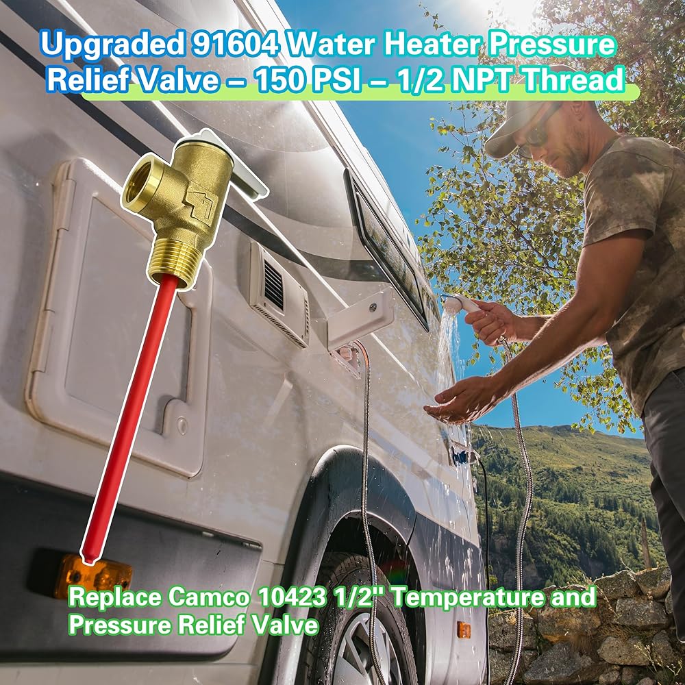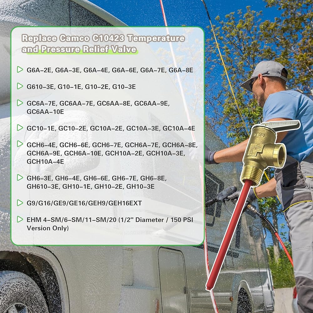 Replace Camco 10423 Temperature and Pressure Relief Valve G6A-2E, G6A-3E, G6A-4E, G6A-6E, G6A-7E, G6A-8E G610-3E, G10-1E, G10-2E, G10-3E GC6A-7E, GC6AA-7E, GC6AA-8E, GC6AA-9E, GC6AA-10E GC10-1E, GC10-2E, GC10A-2E, GC10A-3E, GC10A-4E GCH6-4E, GCH6-6E, GCH6-7E, GCH6A-7E, GCH6A-8E, GCH6A-9E, GCH6A-10E, GCH10A-2E, GCH10A-3E, GCH10A-4E GH6-3E, GH6-4E, GH6-6E, GH6-7E, GH6-8E, GH610-3E, GH10-1E, GH10-2E, GH10-3E G9/G16/GE9/GE16/GEH9/GEH16EXT EHM 4-SM/6-SM/11-SM/20 (1/2" Diameter / 150 PSI Version Only)