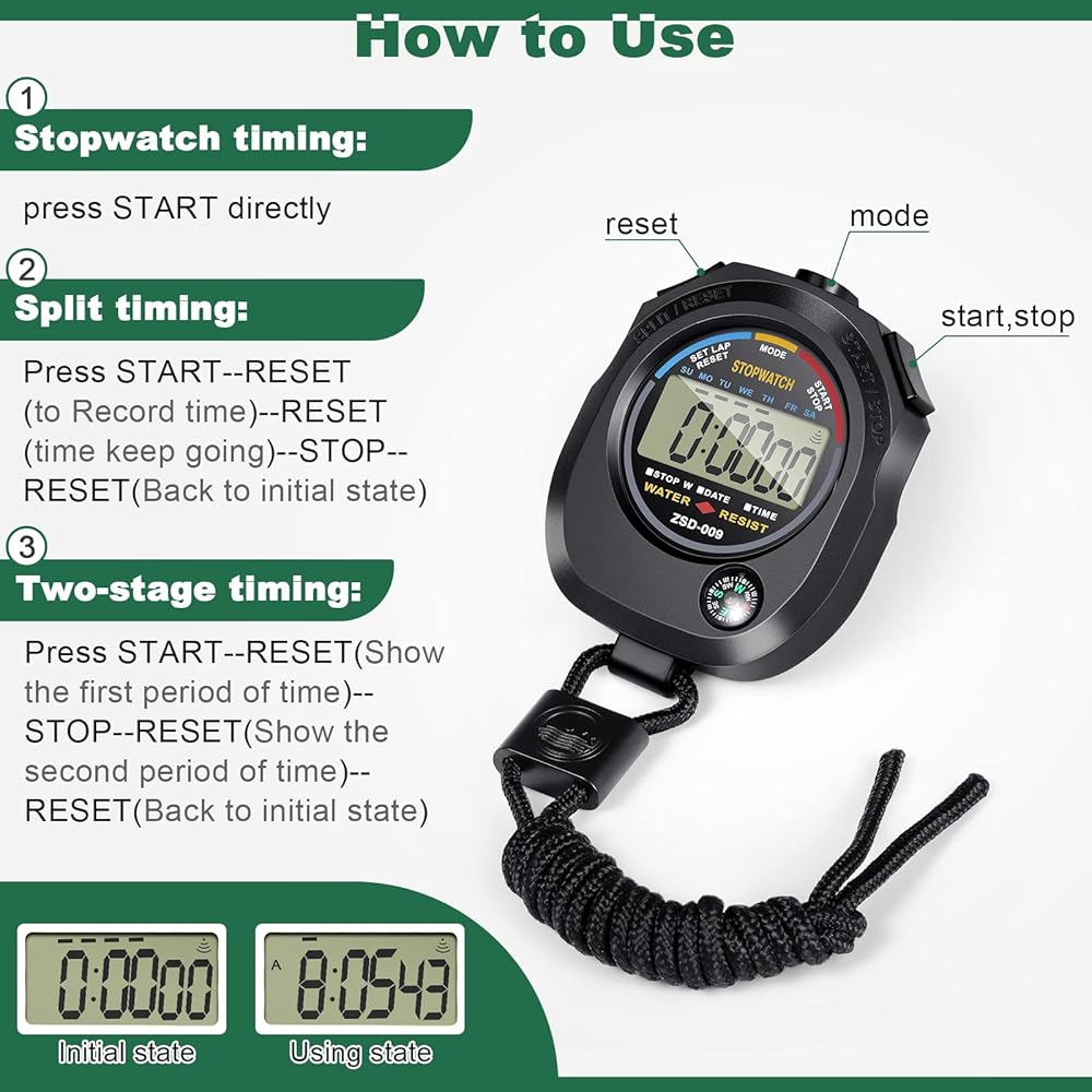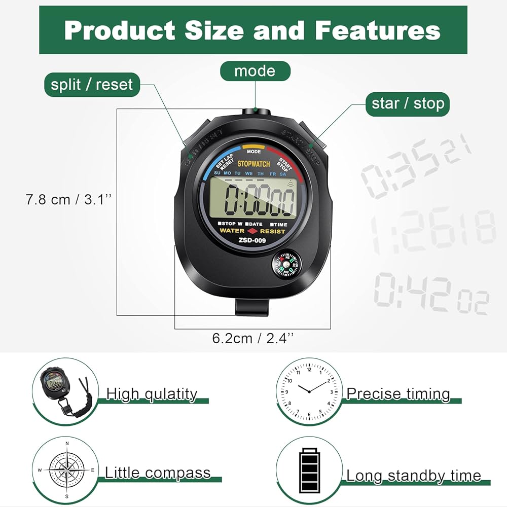 • تطبيقات واسعة: ساعة التوقف الرياضية الخاصة بنا هي جهاز قياس الوقت المثالي للرياضيين والعدائين والمدربين والحكام، وهي مناسبة للجري والسباحة والتدريب وتتبع المباريات والمسابقات وألعاب القوى وما إلى ذلك.