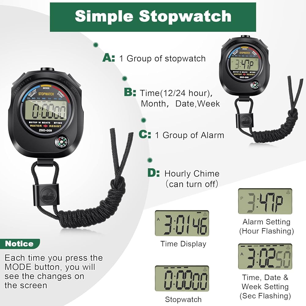• وظيفة الوقت والتاريخ والتنبيه: تم تصميم ساعات التوقف الرياضية هذه بمؤقت للعد التنازلي وساعة تقويم ومنبه، مما يسمح لك بإدارة الوقت بشكل أفضل في الرياضة والحياة اليومية، مثالية للمدربين الرياضيين، وسهلة عرض الوقت وتسجيل التواريخ
