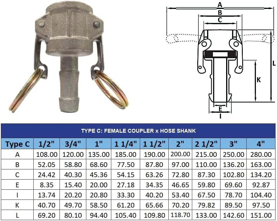 تركيب خرطوم وأخدود من الألومنيوم المائي AF، وصلة أنثى 1/2 بوصة من النوع C مع ساق خرطوم، تصنيف ضغط يصل إلى 150 رطل لكل بوصة مربعة، سهولة الاتصال وفصل Camlock