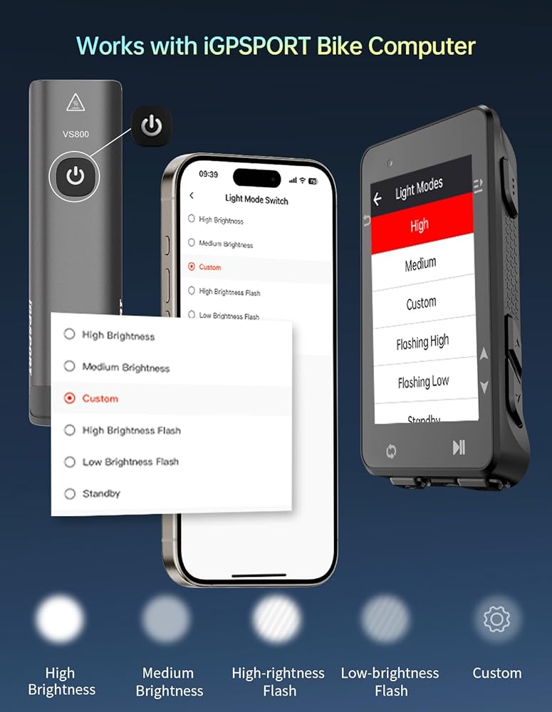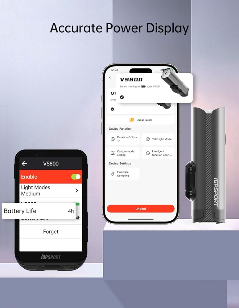 【عرض دقيق لمستوى البطارية】يمكن للمصباح الأمامي للدراجة بلوتوث VS1200 الاتصال بهاتفك الذكي (التطبيق الرسمي - iGPSPORT) أو كمبيوتر الدراجة، يمكنك عرض مستوى البطارية وعمر البطارية بدقة في الوقت الحقيقي.