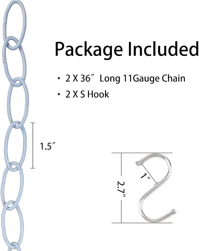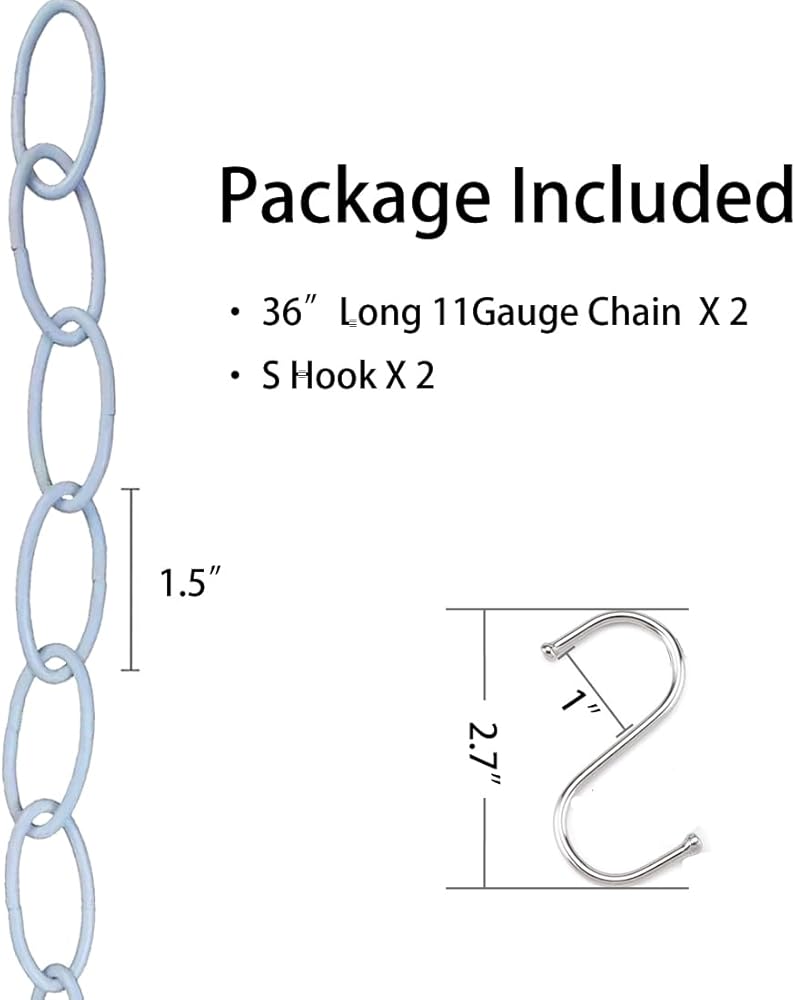 - يبلغ طول السلسلة 36 بوصة، ويبلغ قياس كل وصلة 1.5 بوصة، ويبلغ قياسها 11 بوصة.