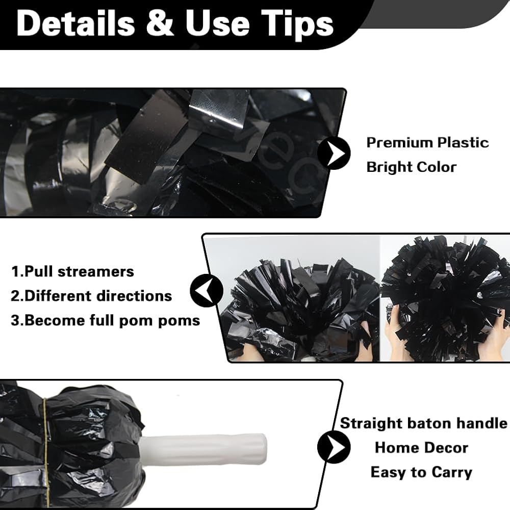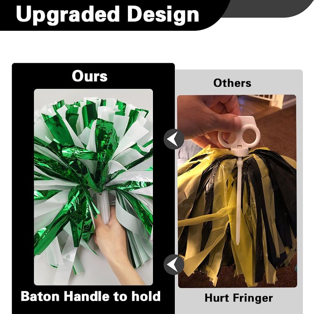 SIMPLE DESIGN: A straight handle at one end of cheerleading pom poms, easy to hold and store for cheering squad outdoor activity, Ligthweight and reuseable, they can last the entire season, not easy to fall apart