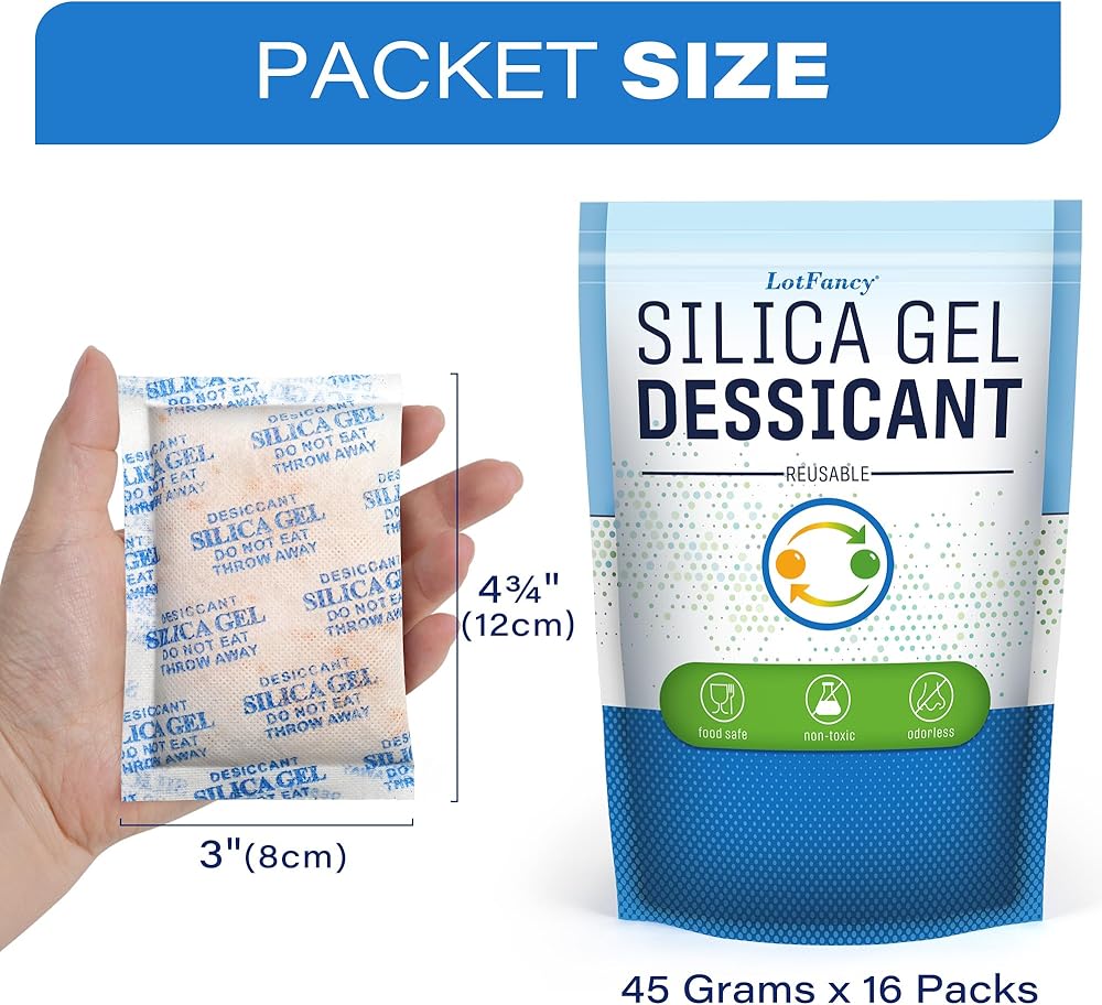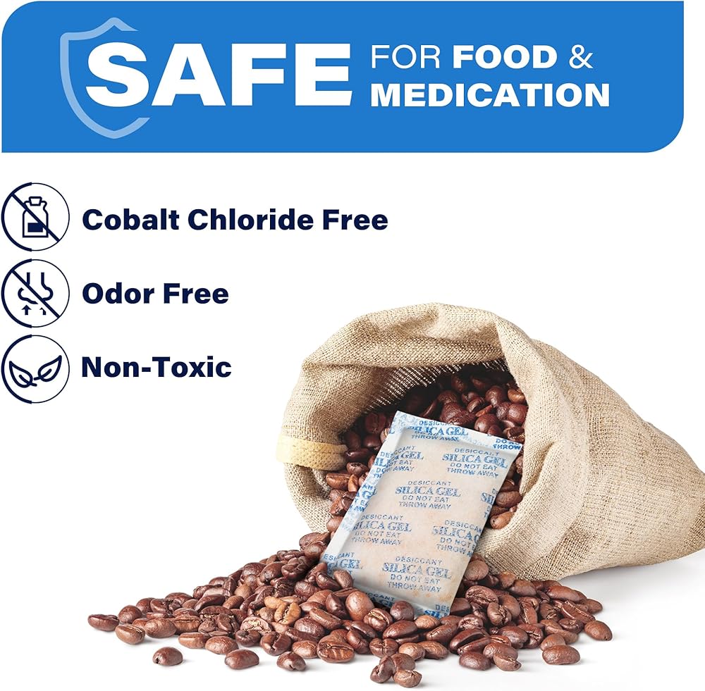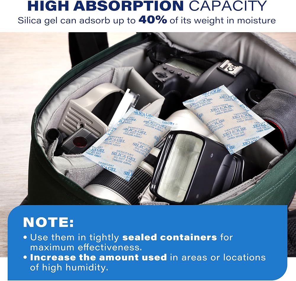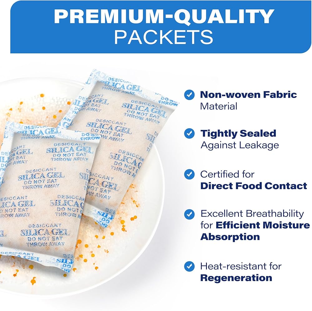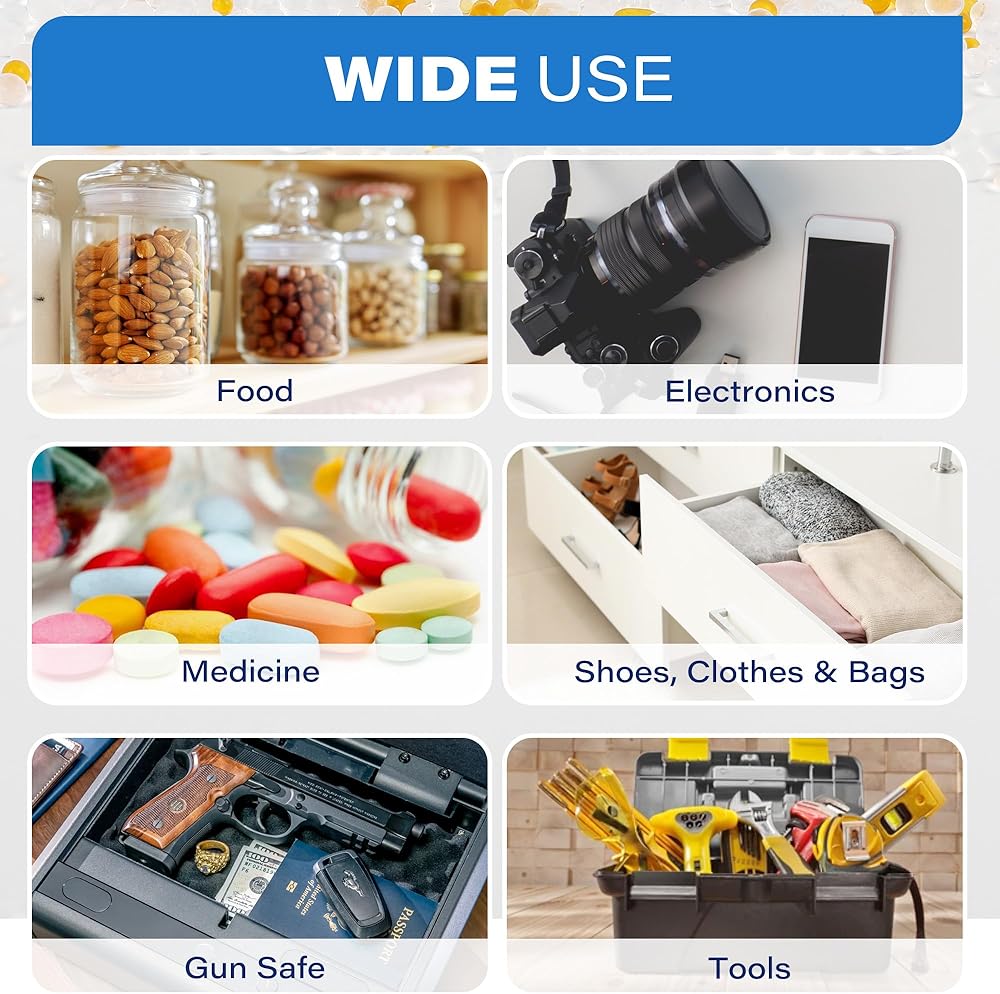 【استخدام واسع】استخدم العبوات المجففة لحماية المستندات المهمة والمقتنيات والكتب وأجهزة الكمبيوتر القيمة والإلكترونيات وعدسات الكاميرا والمجوهرات وألبوم الصور والمواد الجلدية والأحذية والمجوهرات والبنادق والذخيرة وما إلى ذلك. الخرز المجفف الخاص بنا خالٍ من كلوريد الكوبالت. وغير سامة وعديمة الرائحة. آمن للاستخدام مع الأطعمة والأدوية