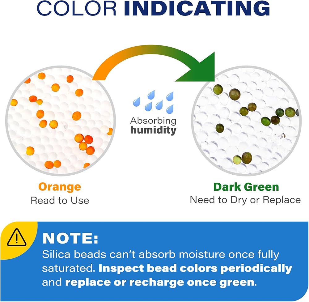 【مجففات تشير إلى أن مجففات جل السيليكا الخاصة بنا تحتوي على خرزات برتقالية تشير إلى تمكن المستخدمين من تحديد بسرعة متى يحتاج المجفف إلى إعادة شحنه أو استبداله، يتغير لون البلورات البرتقالية إلى اللون الأخضر الداكن عندما تصبح مشبعة بالرطوبة.