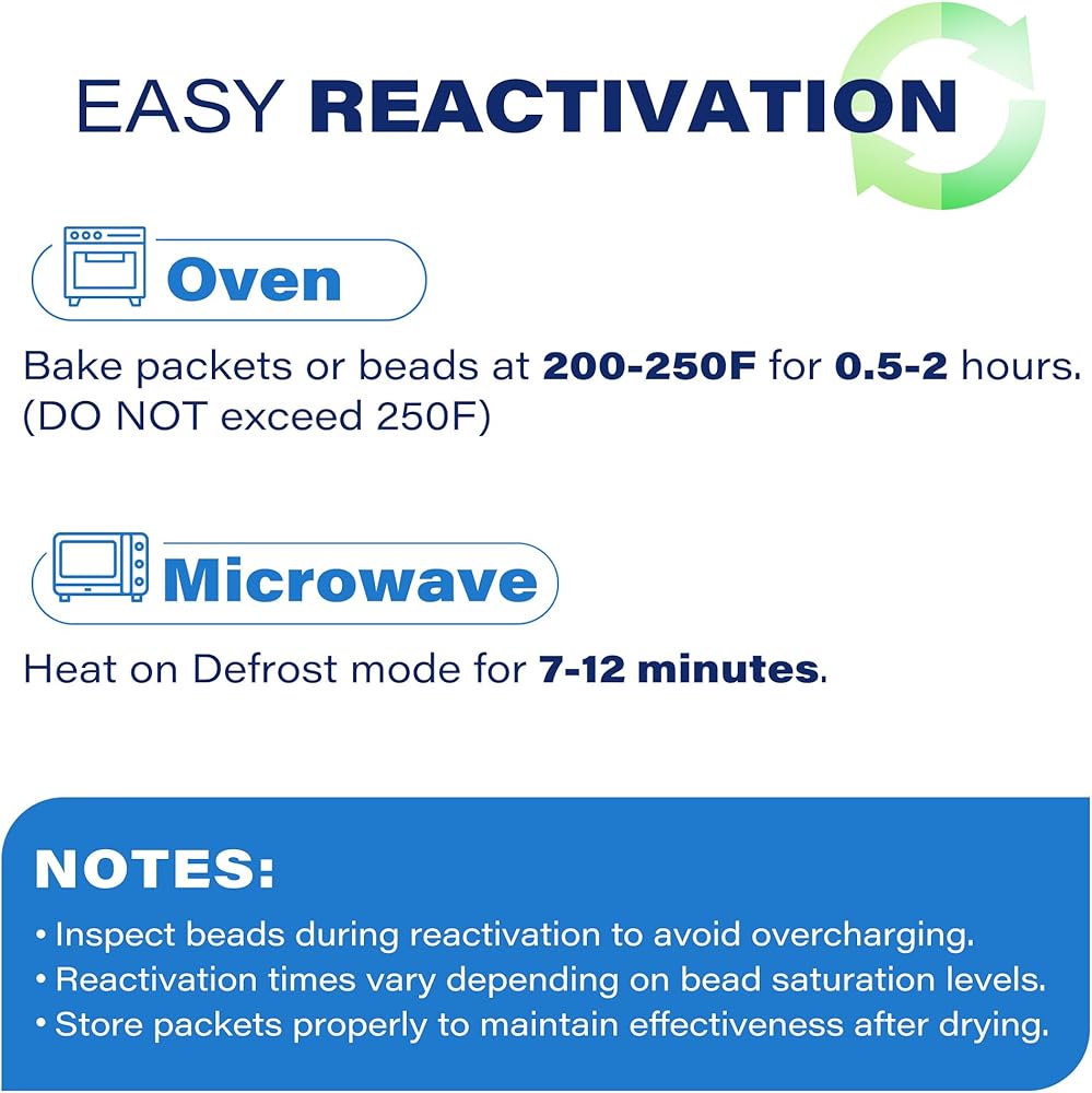 قابلة لإعادة الاستخدام: اضبط درجة حرارة الفرن على 150-200 درجة فهرنهايت. ضع عبوات هلام السيليكا على طبق آمن للفرن أو صينية خبز واتركها تسخن (إعادة الشحن) لمدة ساعة أو أقل حسب مستوى التشبع وحجم الكيس. يوصى بإعادة استخدامها لمدة لا تزيد عن 3 مرات