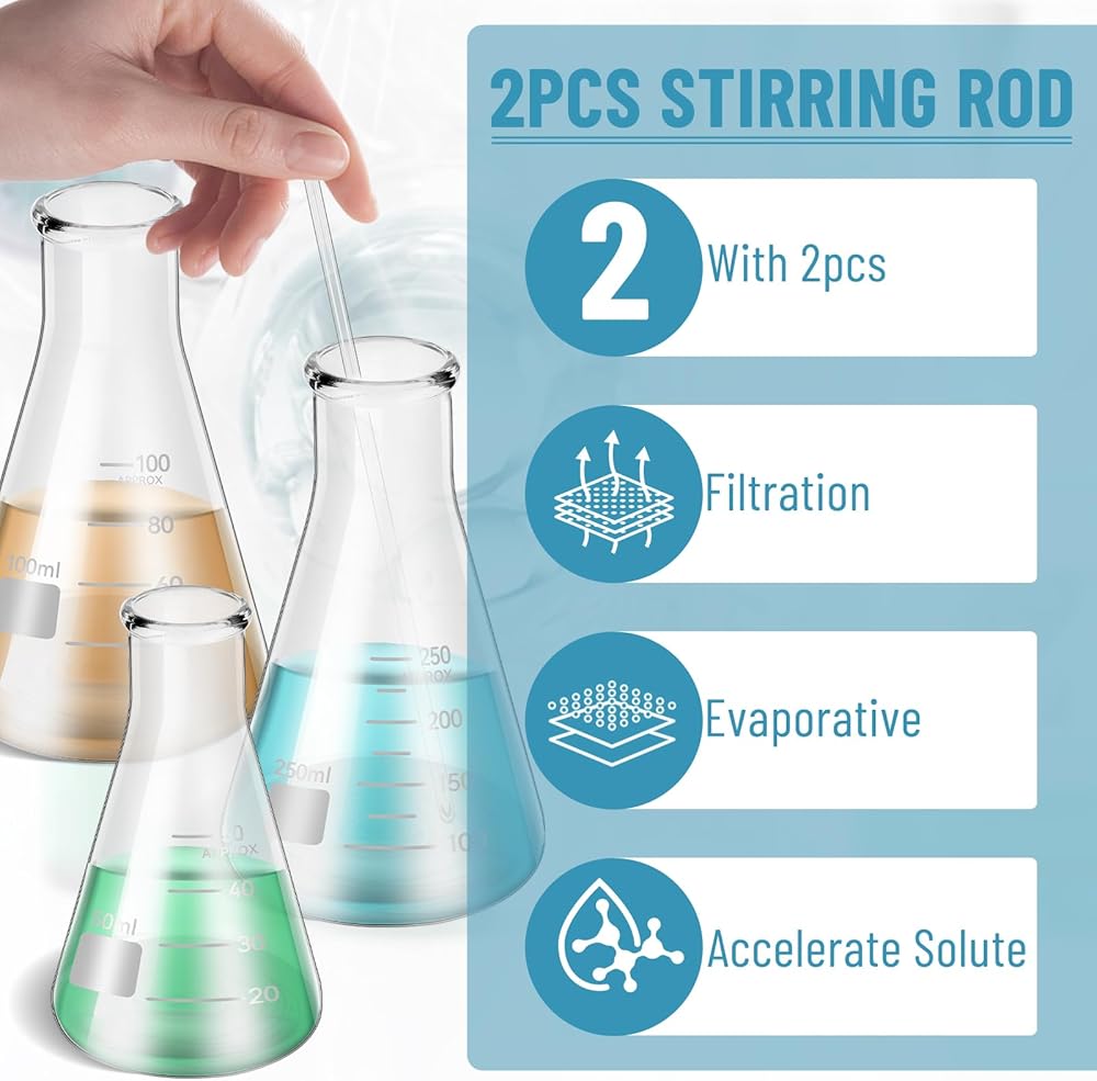 مجموعة أدوات زجاجية للمختبر، طقم قوارير Erlenmeyer 3 قطع 50 مل 100 مل 250 مل، 2 قطارة زجاجية، 3 قطع مجموعة أسطوانات متدرجة 10 مل 50 مل 100 مل، 2 قضيب تحريك زجاجي مع فرشاة تنظيف