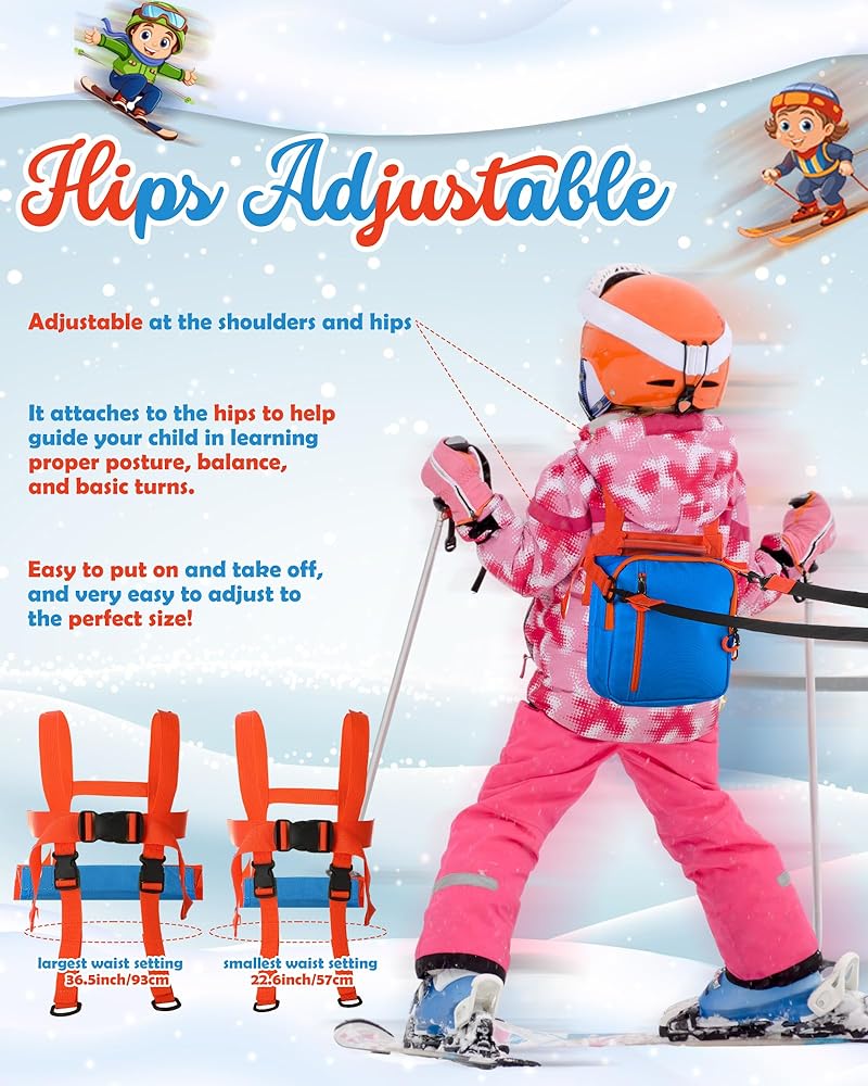 Adjustable Fit: The Ski Harness is adjustable at the shoulders and hips for a ideal fit. The elasticized leash cords are also adjustable, attaching at the hips to guide kids in proper stance, balance, and turning. Easy to put on and adjust for a comfortable fit