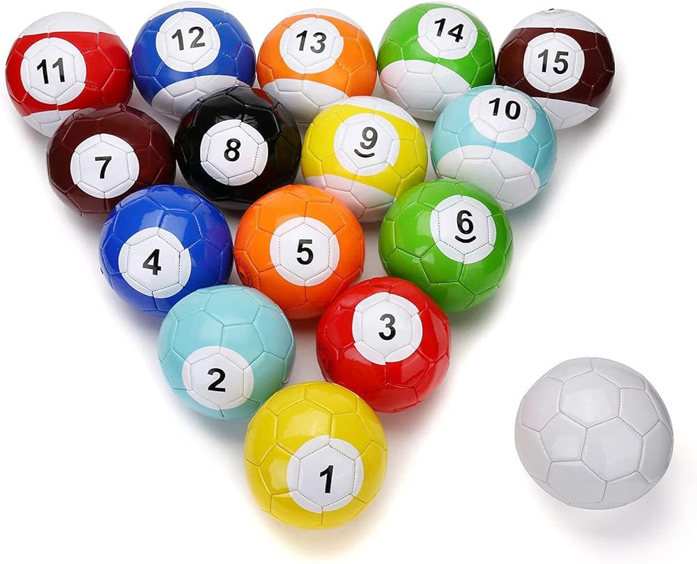 2.Our set of 16 balls, includes 15 soccer balls with standard billiard ball graphics, plus one all white soccer ""cue"" ball.