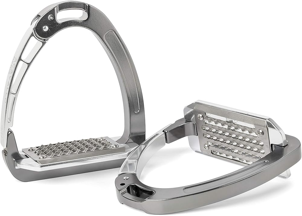 New premium model of our patented, laterally opening Arena stirrups, completely made of certified high-grade anodized aluminum and fitted with a stainless steel tread. Acavallo has carefully chosen and combined the materials used, following detailed research and comprehensive testing. The aluminum, besides giving the stirrup a sleek and elegant appearance, is lightweight and extremely durable, while the stainless steel protects the tread from corrosion, guaranteeing a long life of the product, too. The opening of the stress-actuated locking and release mechanism is located a centimeter higher from the tread to ensure that the foot cannot slip out laterally by mistake and to prevent sand and dirt from delaying the opening action of the arm in case of an emergency. Long holes in the tread prevent sand and dirt accumulations so that the gripping effect is not compromised and a five degree inclination of the tread helps riders to assume the correct posture, relieving tension in their ankles, calves, knees and hips.