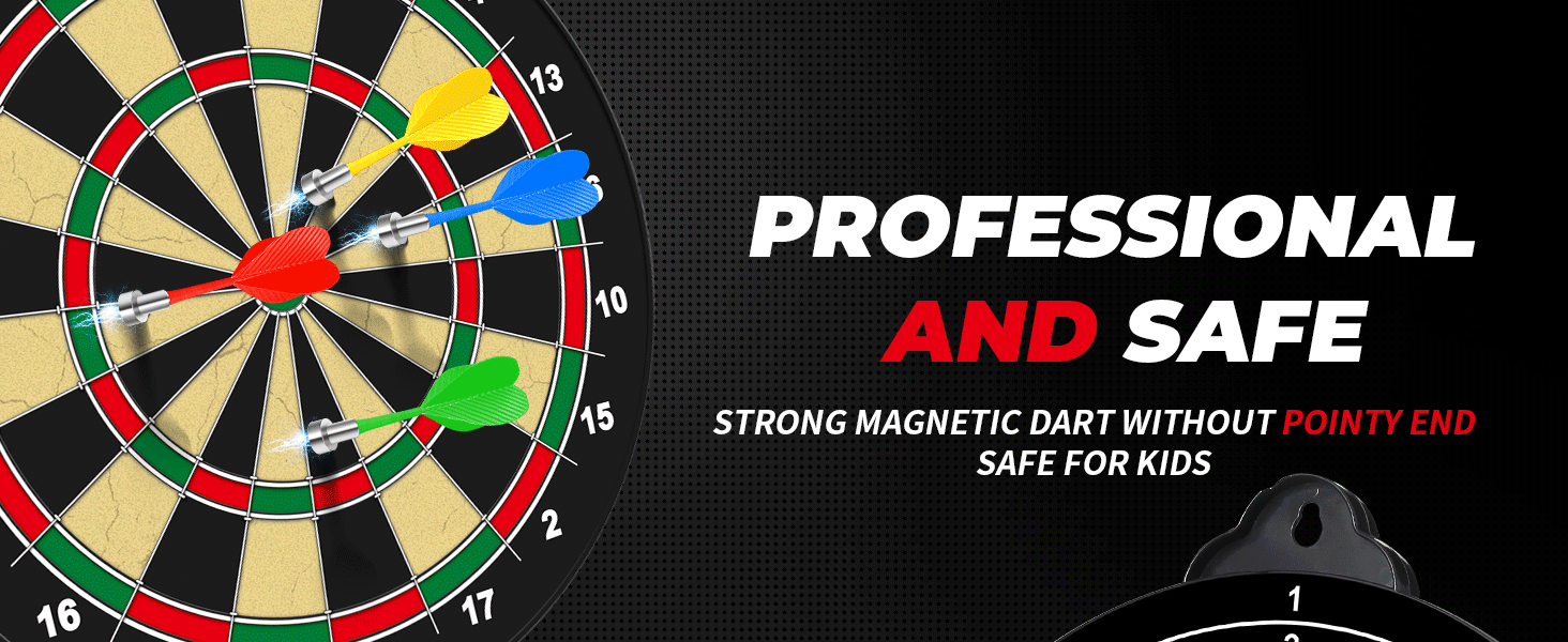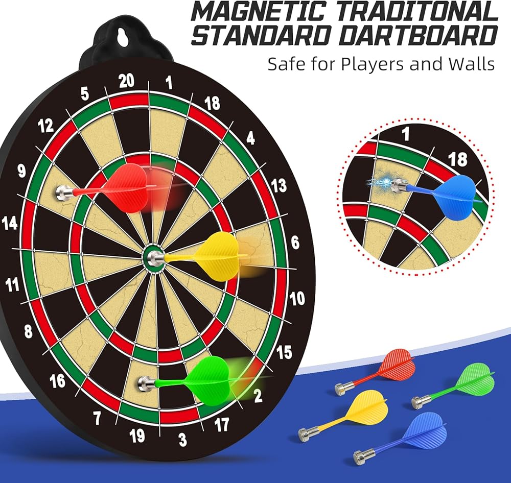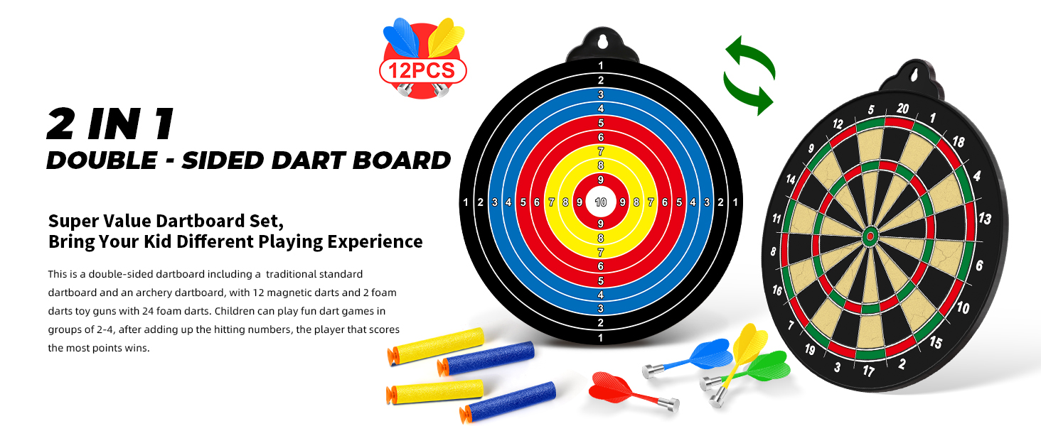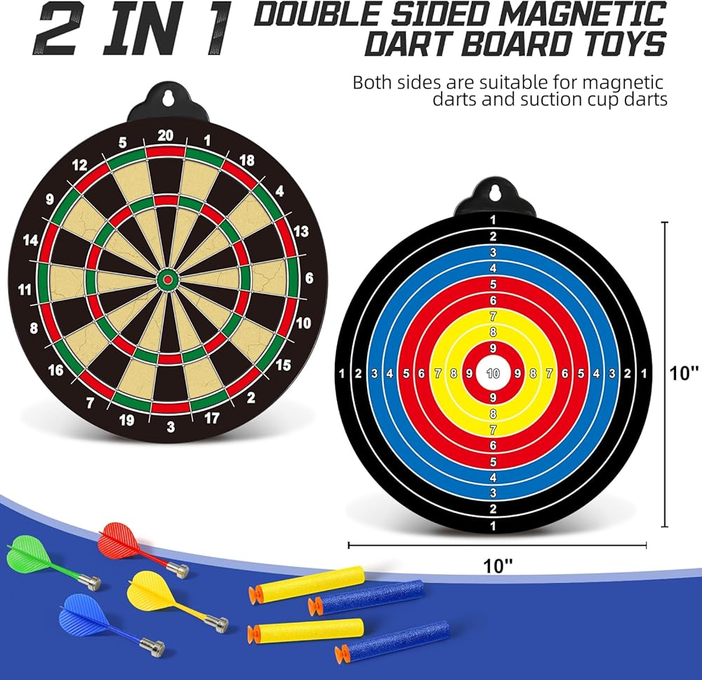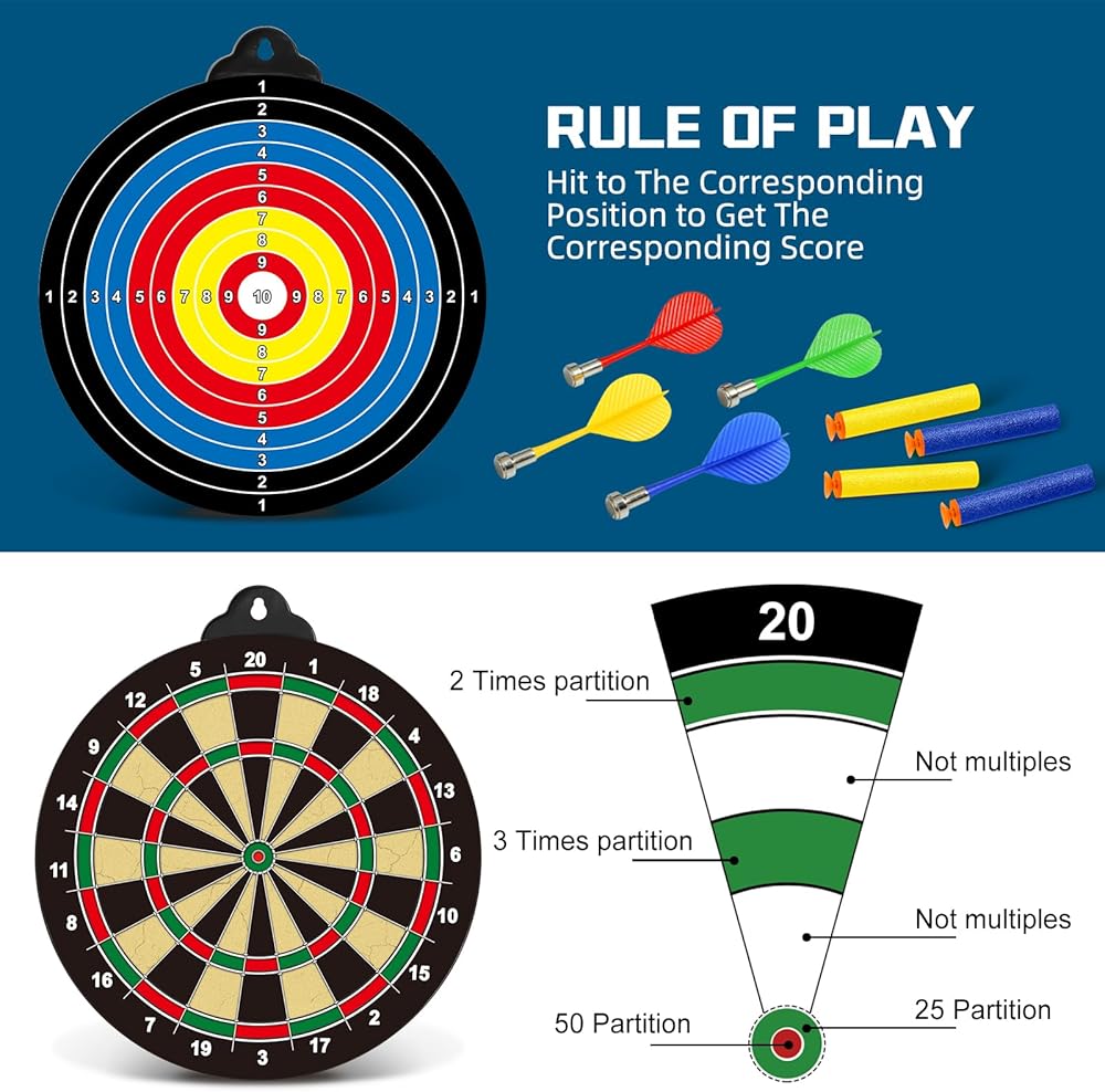 لوحة رمي السهام ذات الوجهين - يمكن أن تحصل لوحة رمي السهام المغناطيسية ذات الوجهين على قاعدتين للعبة على لوحة واحدة، ولوحة رمي السهام القياسية التقليدية في المقدمة، ولعبة رمي السهام في الخلف. تحتوي على 12 سهمًا مغناطيسيًا (3 أزرق، 3 أحمر، 3 أصفر، 3 أخضر) و2 مسدس لعبة رمي السهام الرغوية مع 24 سهمًا إسفنجيًا. ألعاب هدايا مثالية للأطفال من سن 5 و6 و7 و8 و9 و10 سنوات فما فوق.