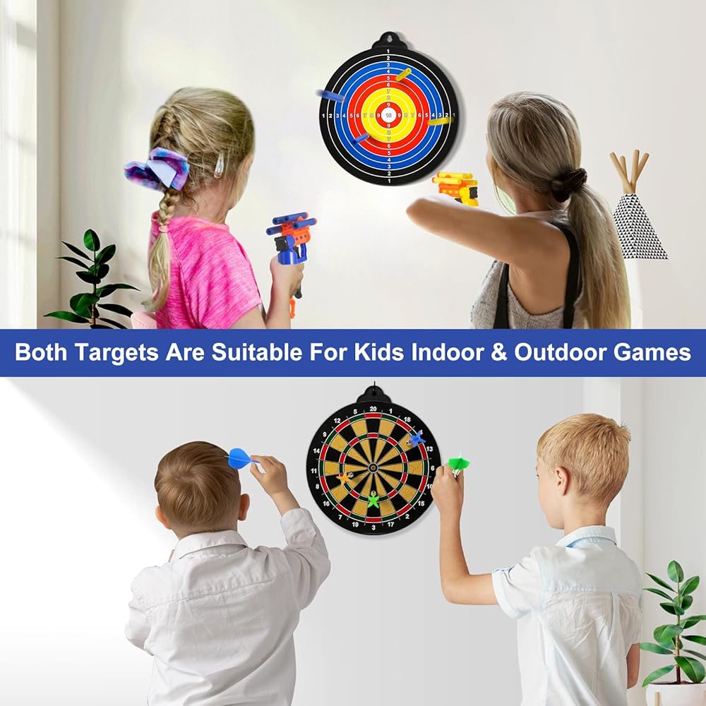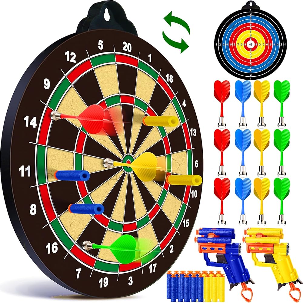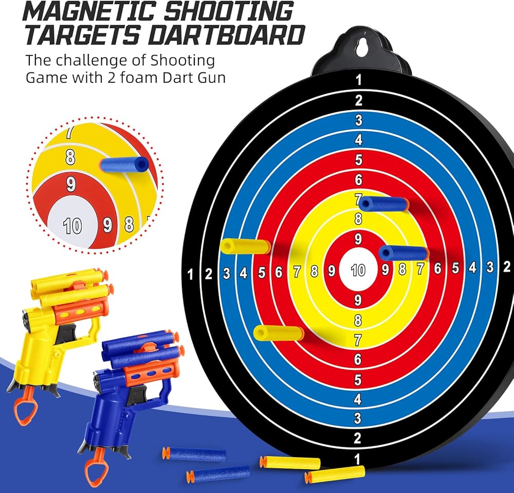 لعبة رمي السهام 2 في 1 لأي عمر - لوحة رمي السهام ذات الوجهين مقاس 13 بوصة للأطفال مع 12 سهمًا مغناطيسيًا آمنًا و2 مسدس لعبة رمي السهام الرغوية مع 24 سهمًا من رغوة الشفط. إنه الحجم المثالي، والسهام مغناطيسية جدًا ويمكن أن تلتصق رصاصة السهام الإسفنجية باللوحة بشكل جيد للغاية. هذه اللعبة متعددة اللاعبين مناسبة لجميع أفراد الأسرة، وهي لعبة جيدة للآباء لمرافقة أطفالهم. ألعاب داخلية وخارجية ممتازة وألعاب الحفلات للأطفال والكبار.