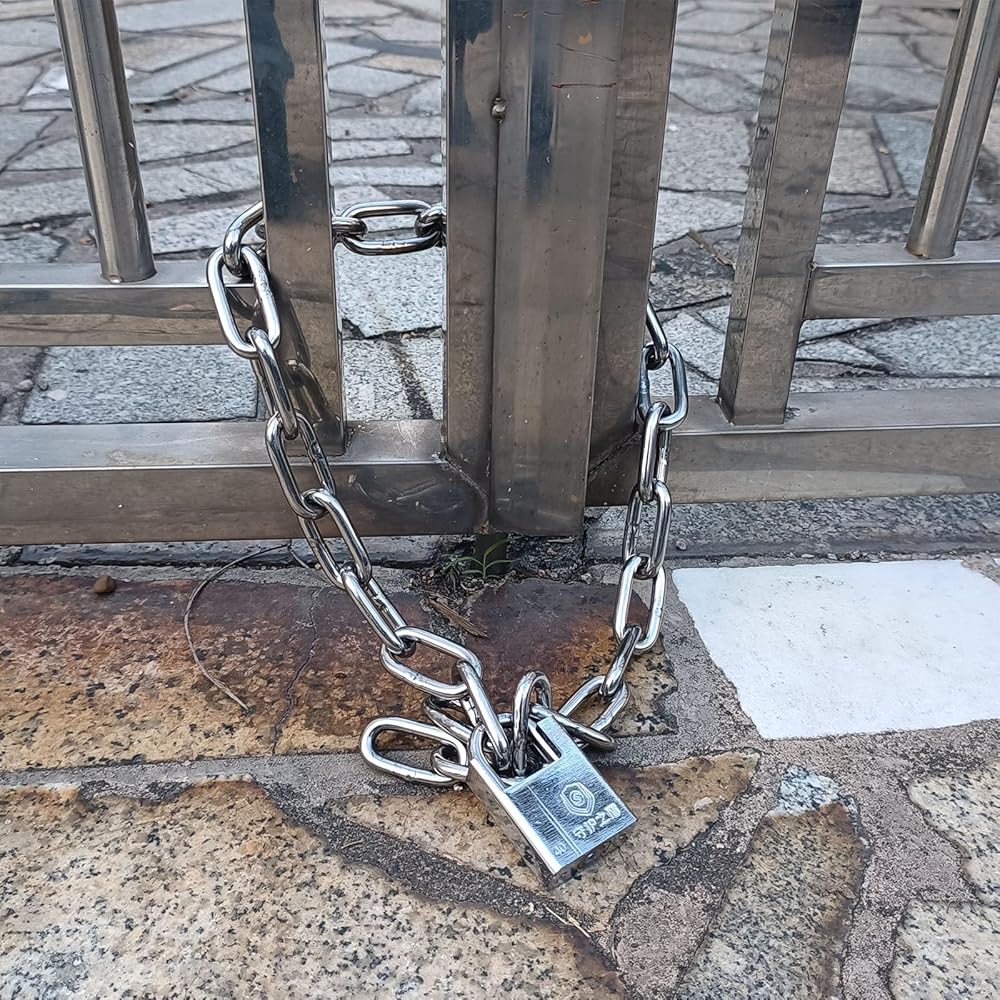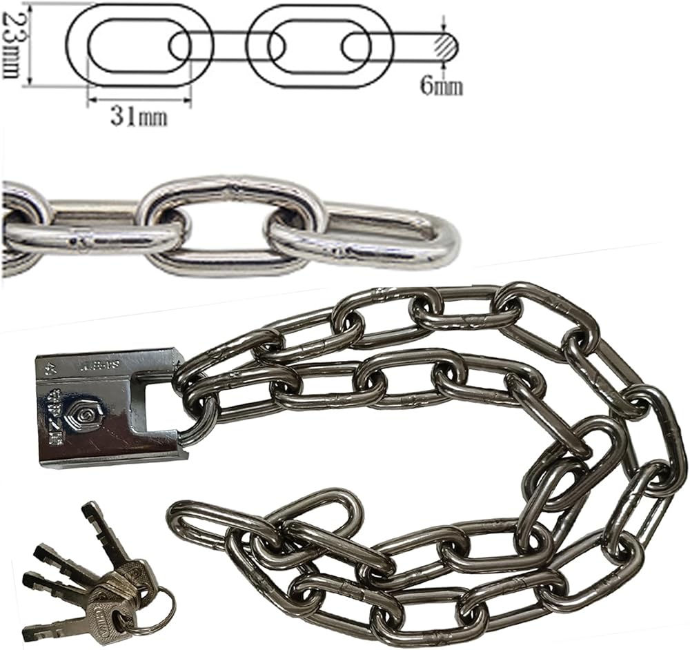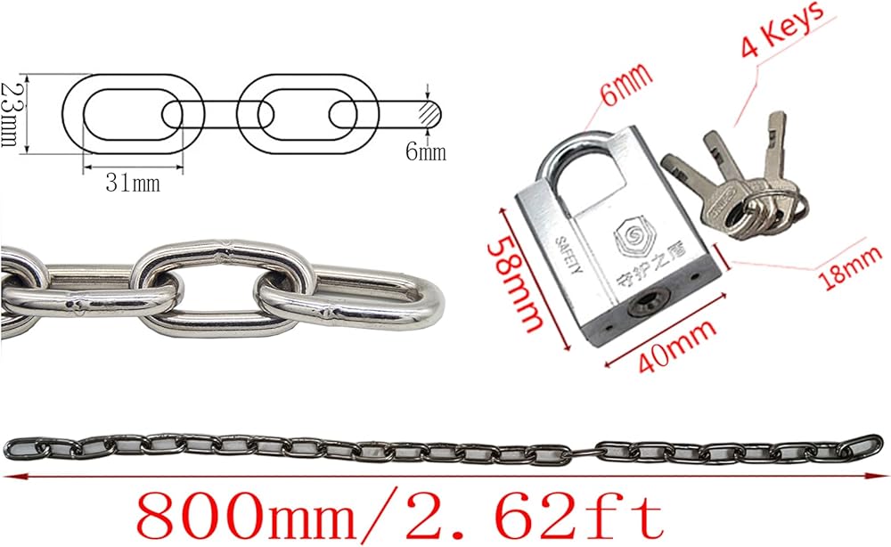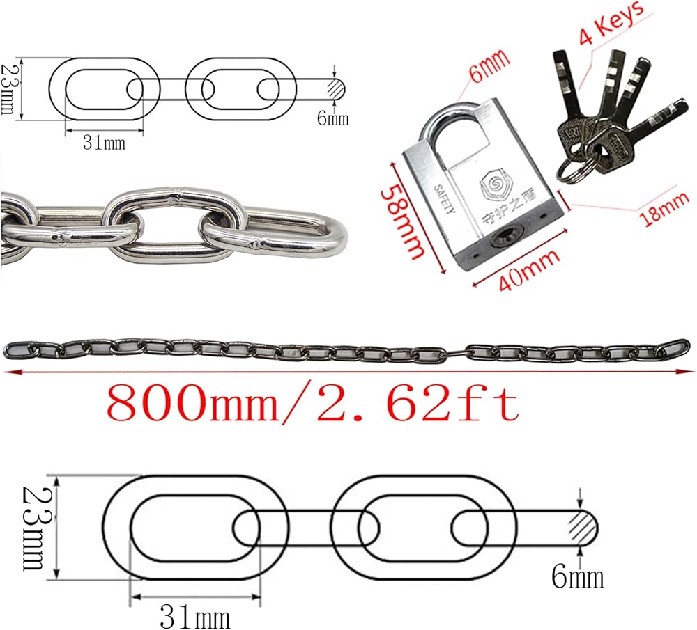【مواد الفولاذ المقاوم للصدأ المتميز】 تم تصميم مجموعة القفل والسلسلة الخاصة بنا لتوفير أقصى قدر من الأمان ، وهي سلسلة مصنوعة من الفولاذ المقاوم للصدأ 6 مم ، طولها 2.62 قدم لسهولة تحمل.