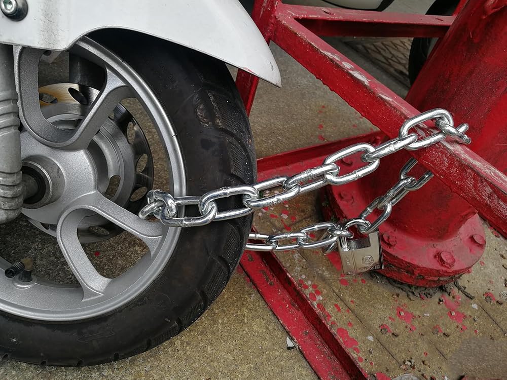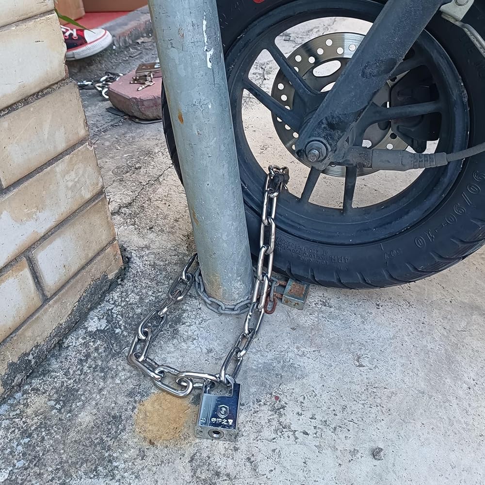 【تطبيق واسع】 السلسلة طولها 31 بوصة ، وهو ما يكفي لقفل دراجتين معًا ، وهو مثالي لمكافحة الدراجات والدراجات والدراجات الإلكترونية والدراجات البخارية والدراجات النارية والسلالم وزراعة العشب والبابات والأسوار والمعدات الرياضية والمزيد.