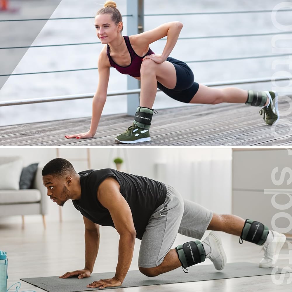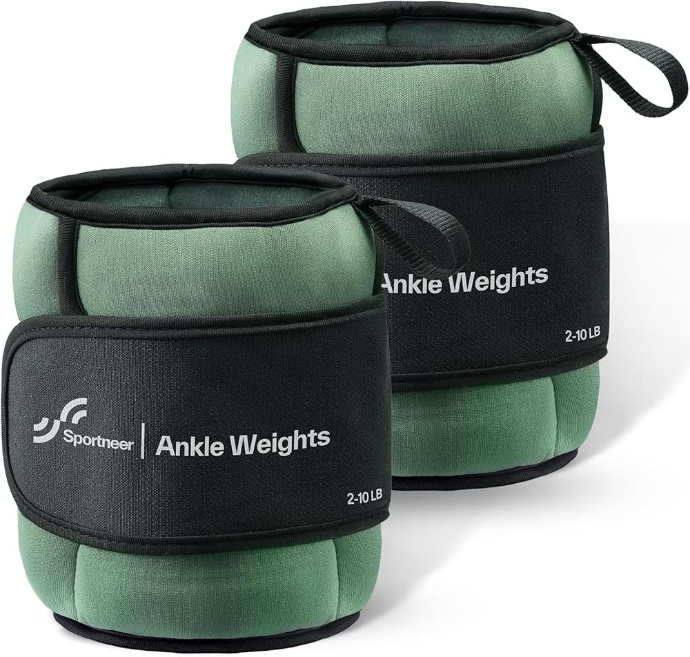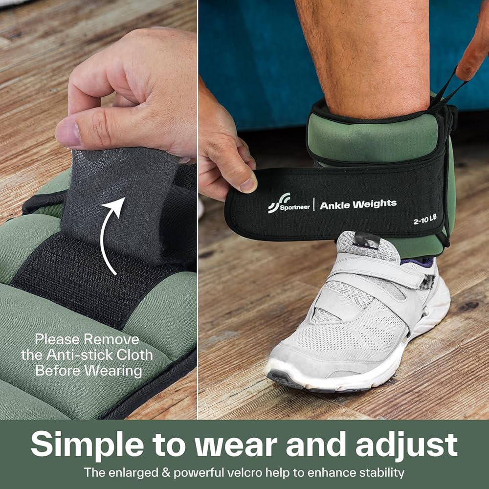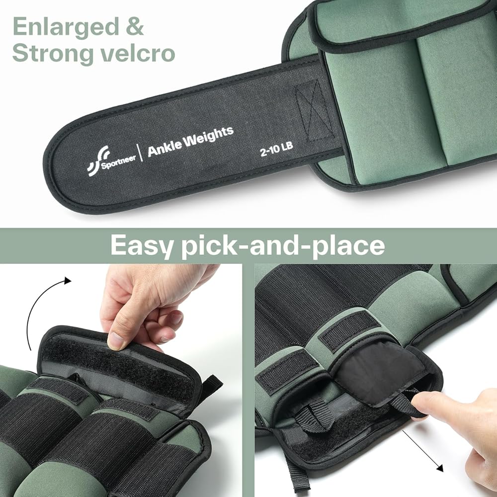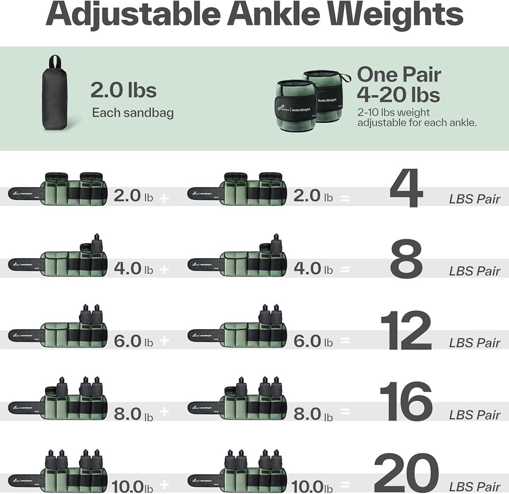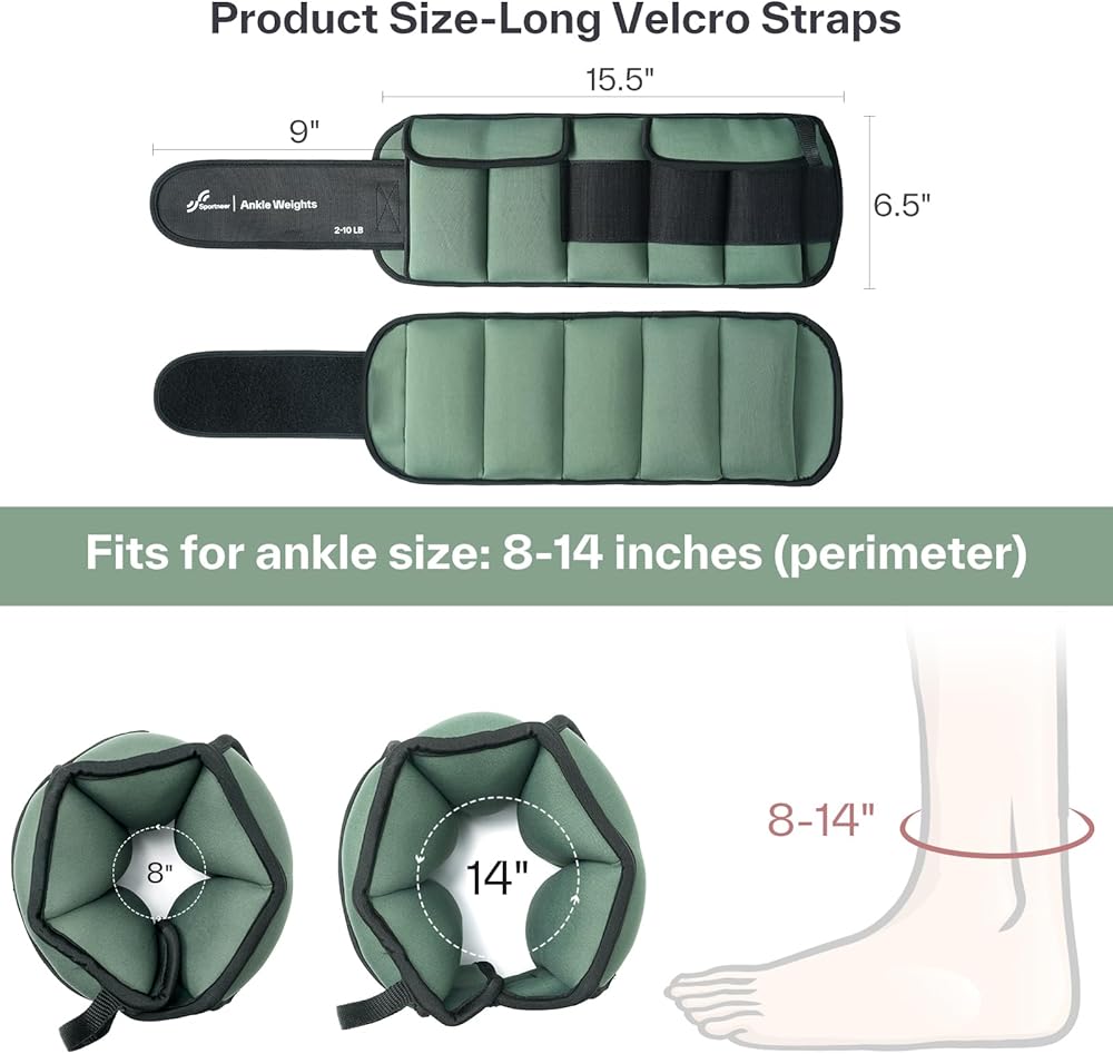 أوزان الساق القابلة للتعديل: تم تصميم الأكياس الرملية لأوزان الكاحل لتكون 10 أرطال لكل منها ، مع وزن إجمالي قدره 20 رطلاً للزوج. الأكياس الرملية الصغيرة الداخلية داخل كل وزن قابلة للفصل ، مع وزن 2 رطل لكل منهما. يمكن ضبط كل وزن واحد من 2 إلى 10 رطل ، ويمكن ضبط زوج واحد من الأوزان عند 5 مستويات مختلفة من 4 إلى 20 رطلاً عن طريق إضافة أو تقليل أكياس الرمل