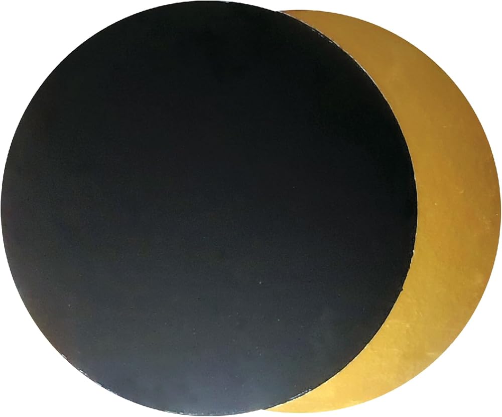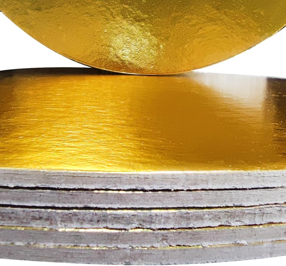 These sturdy compressed boards are perfect for all your bakery and dessert applications. Lift, transfer, and carry your cakes without worrying about damage. Save precious time with this disposable food-safe, easy-to-clean circle board, grease resistant, very strong, durable, and at the same time flexible. Oil and moisture are not absorbed, thus wiping with a damp clean cloth while decorating will suffice. Not only is it perfect for circle cakes, but it is also a suitable base for pies, confections, and cheesecakes, and can be used as a tray for other desserts such as cupcakes, and pastries. Both sides are food safety, you can use silver or black sides, it depends on you. Food-grade gold finish. Thickness: 3 millimeters each cake board. Count of 10.