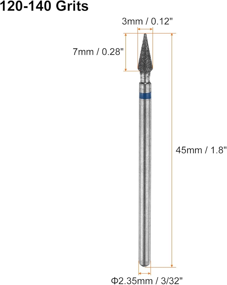 الحجم - فريك: 120-140 فريك ؛ القطر: 3 مم / 0.12 "؛ طول الرأس: 7 مم / 0.28" ؛ قطر شانك: 2.35 مم / 3/32 "؛ طول شانك: 38 مم / 1.5" ؛ إجمالي الطول: 45 مم / 1.8 "؛ يتم تعبئة مجموعة بتات الماس متعددة الأغراض في صندوق بلاستيكي قوي لراحتك لحمل وتخزين