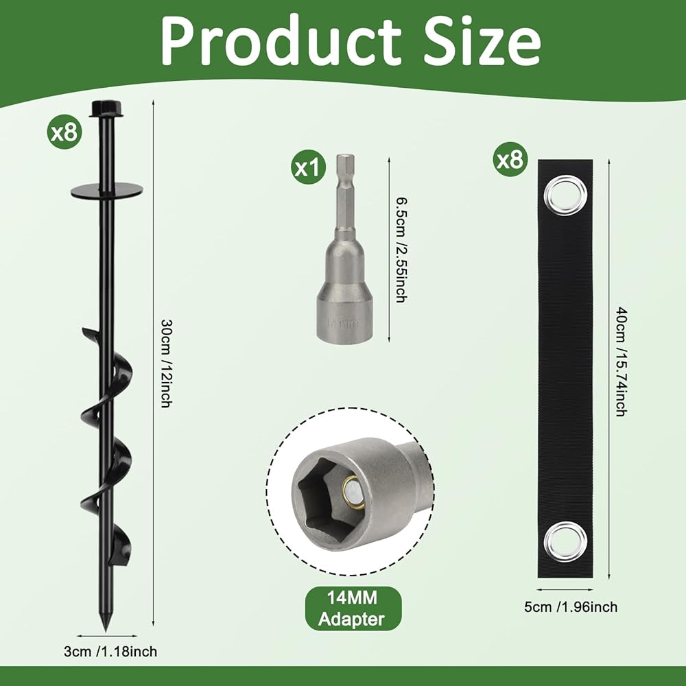 Package Details: Contains 8 packs of 12-inch screw ground anchors, 8 pieces of nylon cable ties, and 1 pieces of hexagonal heads. Meeting your daily needs for outdoor equipment