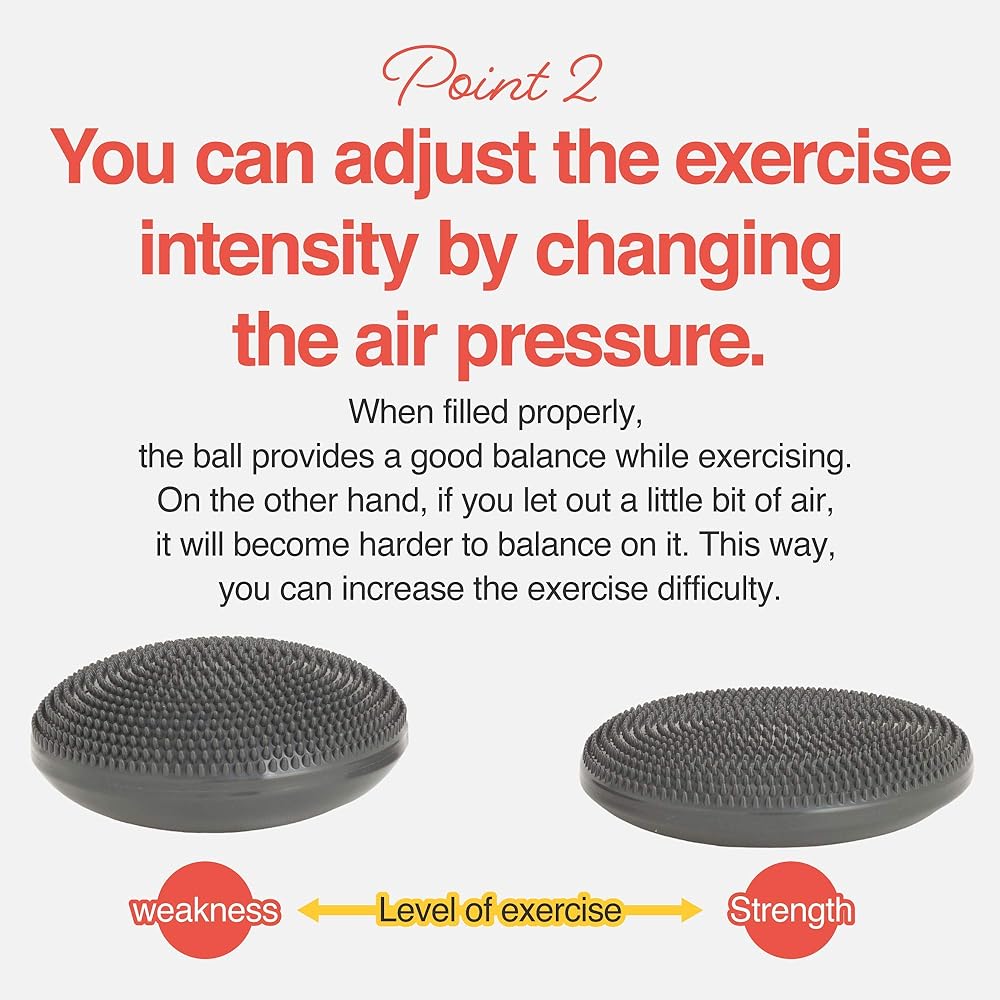 Primasole's balance disk has a 550lb load limit. You can use it without any concerns. It is suitable for a variety of exercises including when on a diet, improving posture, or torso training. You can adjust the intensity of the exercise from the air pressure. It is bumpy on one side, and it can be used how you like for different purposes.