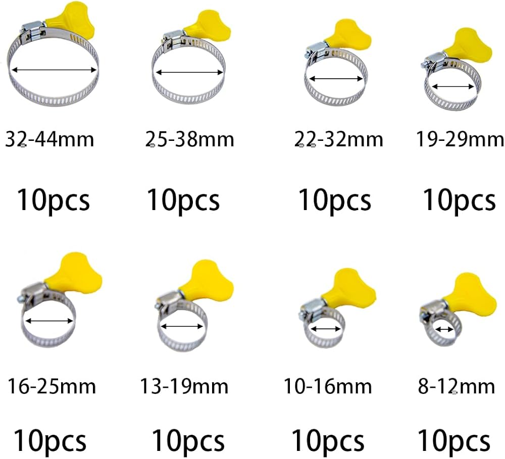 You will get 80pcs key-type hose clamp, 8 size 8-12mm 10-16mm 13-19mm 16-25mm 19-29mm 22-32mm 25-38mm 32-44mm, each size has 10pcs.