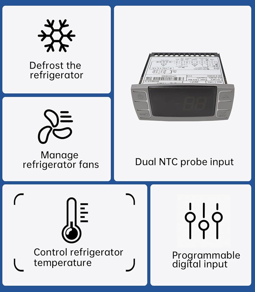مستشعر ممتاز: تتميز وحدة التحكم في درجة الحرارة بمدخلين لمسبار NTC، أحدهما مخصص لتنظيم درجة الحرارة والآخر للتحكم في درجة حرارة إنهاء إزالة الجليد وتشغيل المروحة، تكملها مدخلات رقمية قابلة للتكوين لتجربة مستخدم مخصصة