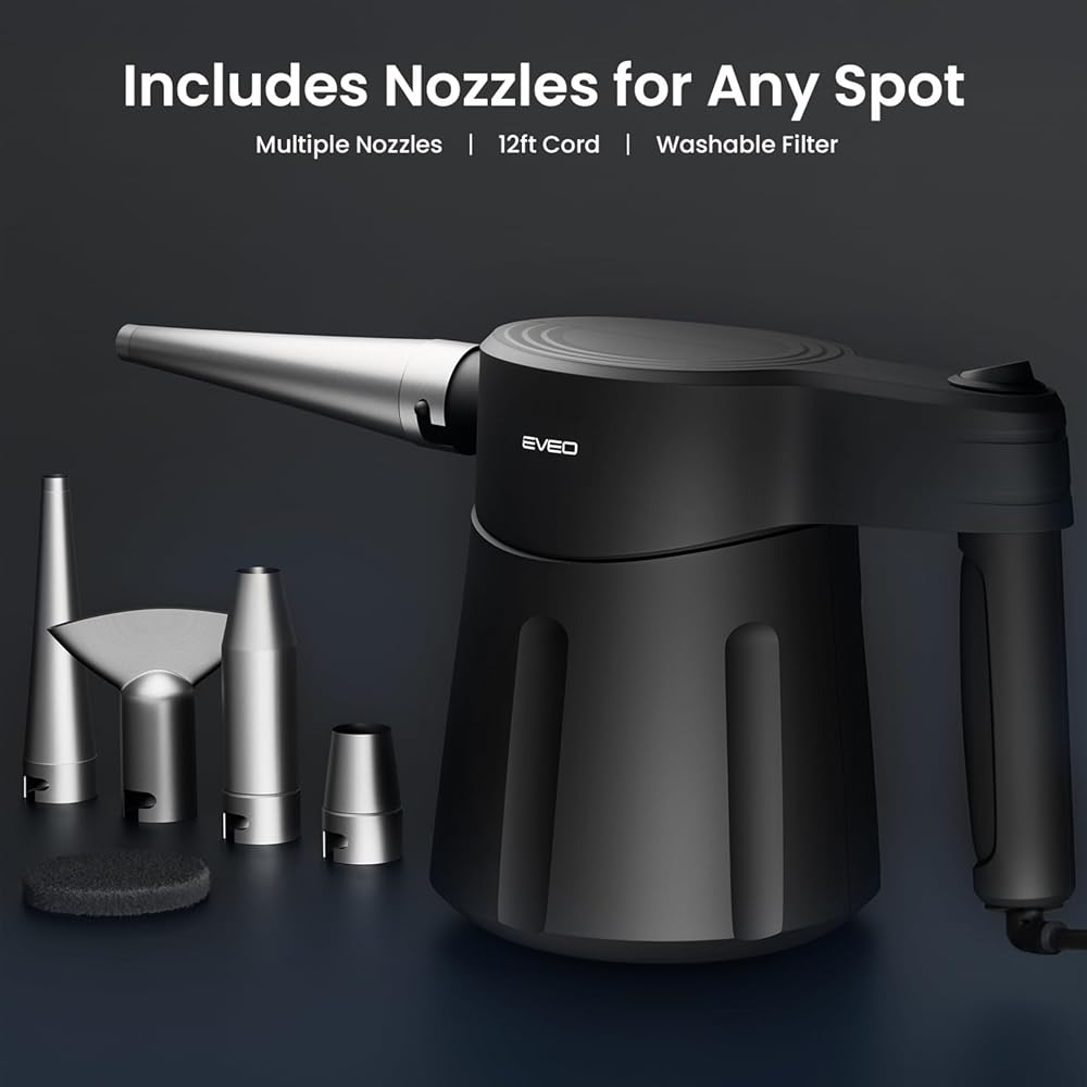 منفضة الهواء الكهربائية EVEO® - منفضة الهواء المضغوط ذات التدفق الأقصى | مجموعة تنظيف الكمبيوتر الكهربائية - منفضة الكمبيوتر منظف الكمبيوتر للكمبيوتر والكمبيوتر المحمول ولوحة المفاتيح والمزيد، منفضة الهواء الكهربائية - AX أسود (350 واط)