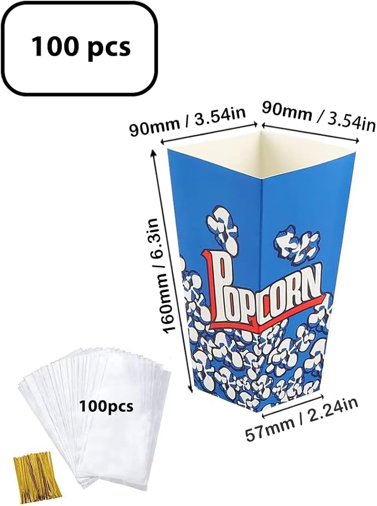 Popcorn Boxes Size:3.5x2.3x6.3inch /9x5.7x16cm(L*W*H)Capacity is approximately 28 ounces.