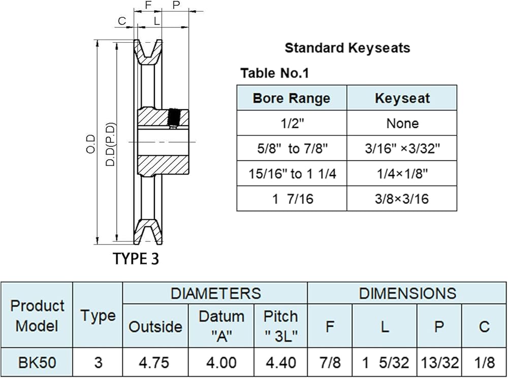 BK50-5/8، BK50X5/8 v بكرة الحزام، 4.75 بوصة OD، 5/8 بوصة تتحمل، مادة حديد الزهر، بكرة محرك ذات أخدود واحد BK للأحزمة "4L" أو "A" والأحزمة "5L" أو "B"