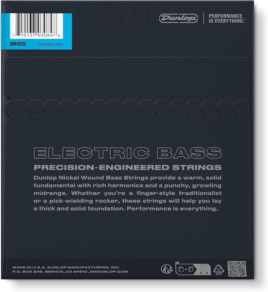 Dunlop Nickel Wound Bass Strings lay down the groove with a warm, solid fundamental while cutting through the mix with a punchy midrange growl and rich harmonics. Each set is tonally balanced from string to string to give you a consistently robust low end no matter where you play on the fingerboard. Whether you're a traditionalist, a slapper, or a pick-wielding rocker, Dunlop Nickel Wound Bass Strings give you what you need to build a solid foundation and drive the music forward. As with everything we make, we started from scratch and designed Dunlop Strings from the ground up to fit our vision of what a string should be. Each of our formulas is developed with on-the-road feedback from some of the greatest players in the world. At our headquarters in Benicia, California, we take a hands-on approach, running our machines at a slower pace and producing smaller batches, which allows us much more control at every step of the process. We also seal them in a protective bag for freshness and longevity. Every set of Dunlop Strings is the result of our obsession with details, which is ultimately an obsession with quality, consistency, and serving your needs as a player.