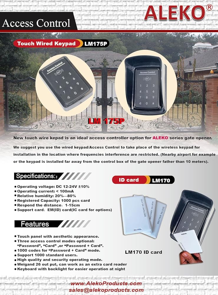 Compatible with all ALEKO brand slide and swing gate openers and 12/24V DC gate or garage door openers from other brands as well. Three different access modes: works with a password, with ALEKO LM107 ID cards, sold separately, or with a password and ID cards together. Keyboard has a built in backlight for better visibility and easier operation at night. Pair with ALEKO's LM107 or LM108 mounting post, sold separately, to make the keypad convenient and accessible. Technical specifications: Operating current: