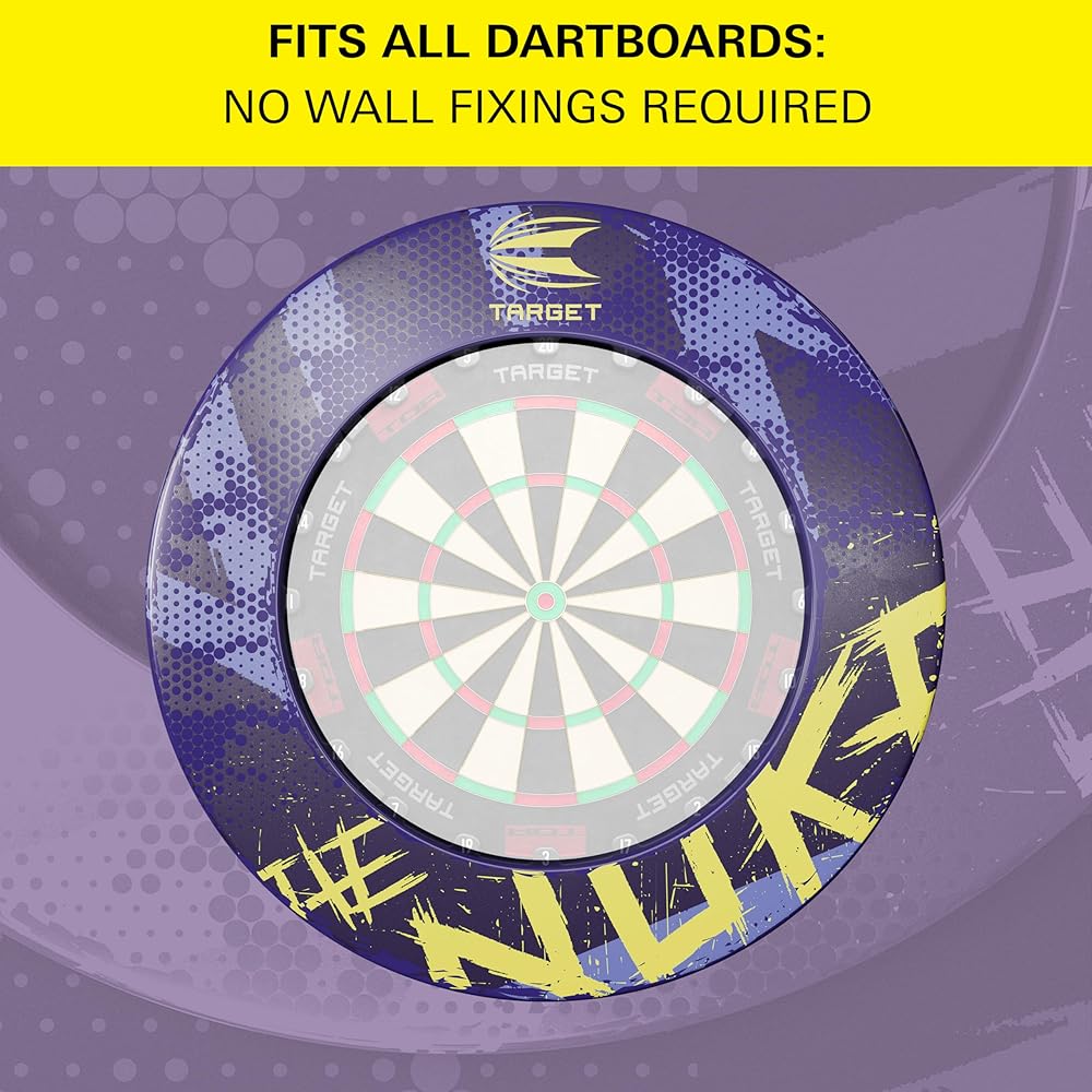 Crafted in collaboration with ""The Nuke"", the Luke Littler Dartboard surround features the distinctive vibrant purple and yellow colour scheme, this surround adds a striking touch to any dart setup. Designed to fit securely around your dartboard, it protects your walls from stray darts while showcasing the unique style of Luke Littler. Enhance both the aesthetics and functionality of your darting area with this eye-catching, high-quality surround. No wall fixings are required to install this surround, simply clip into place around the dartboard for additional wall protection against stray darts. Made from an Active Reflex Polymer material which prevents unsightly penetration marks, featuring a ribbed back design for improved strength and lightweight structure. The pack contains 1x Target Darts Luke Littler Dartboard Surround. Compatible with any competition-standard dartboard.