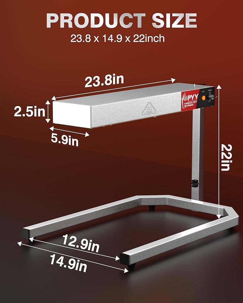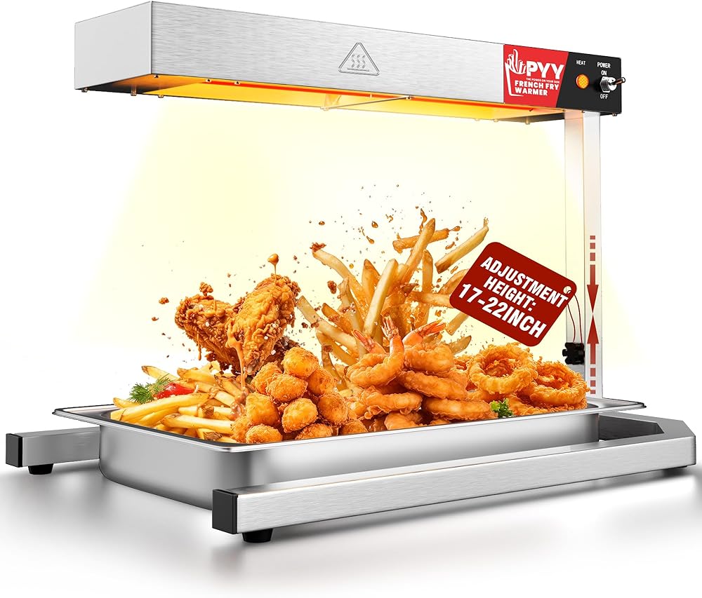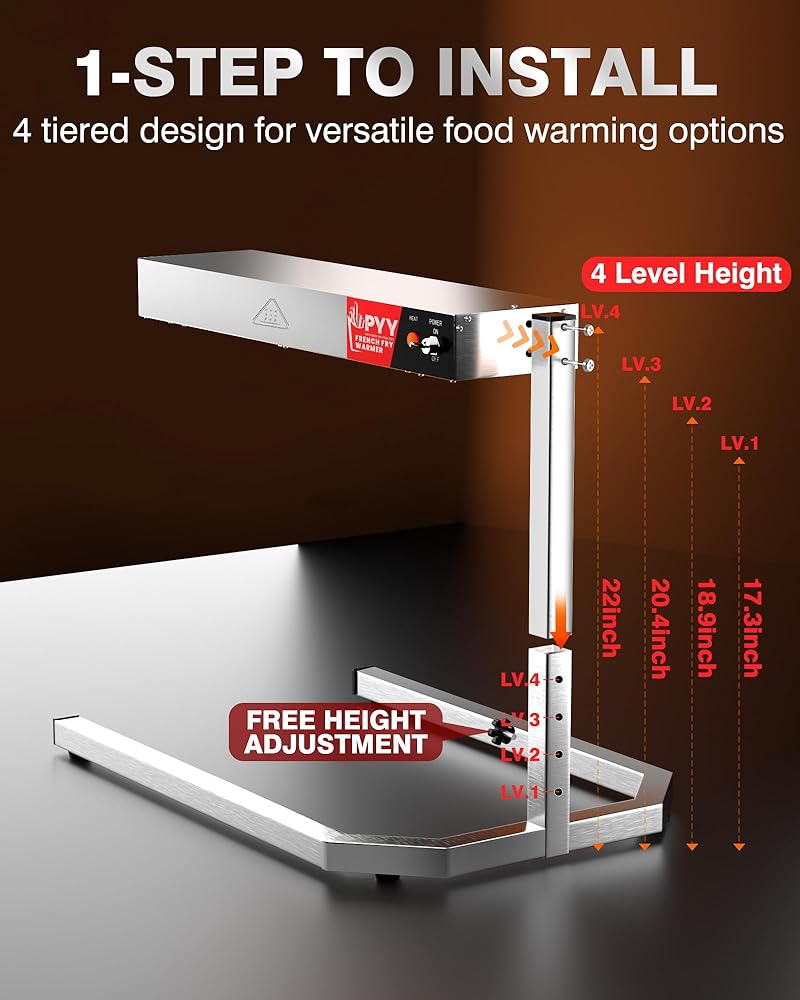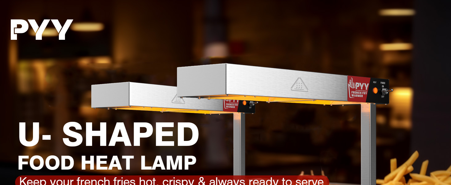 مصباح تسخين الطعام PYY - سخان طعام بارتفاع قابل للتعديل مع حامل قاعدة على شكل حرف U، ضوء تجاري لتدفئة الطعام على سطح الطاولة مع حامل للبطاطس المقلية وإشعاع التسخين الكهربائي، 500 وات من الفولاذ المقاوم للصدأ فضي