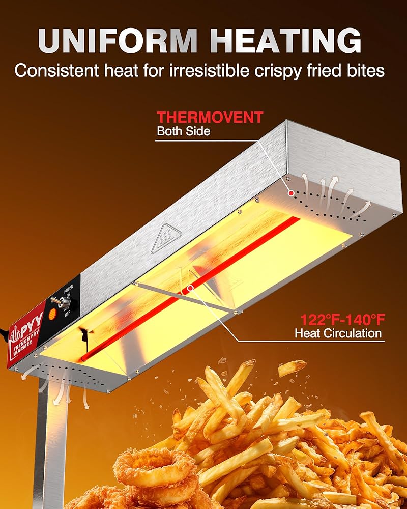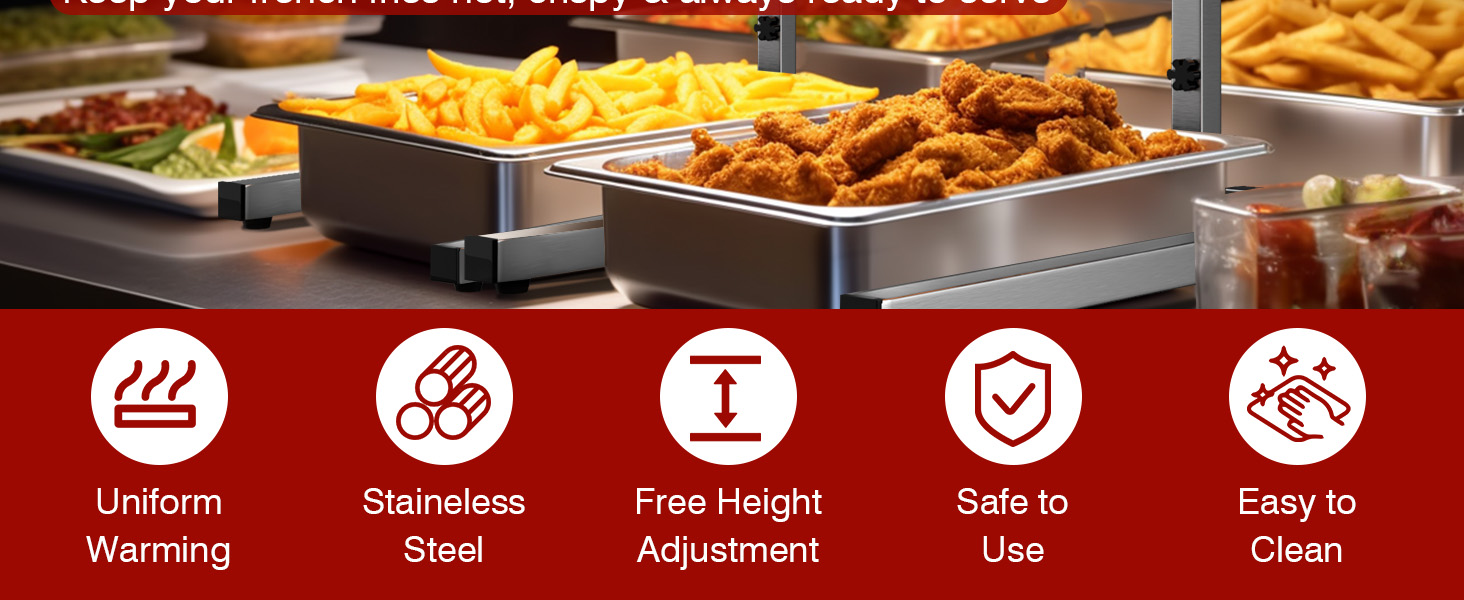 مثالي لمجموعة من إعدادات الطهي: مثالي لمطاعم البوفيه الصاخبة ومفاصل الوجبات السريعة والفنادق، يعد هذا السخان خيارًا ممتازًا لعناصر التسخين مثل البطاطس المقلية وحلقات البصل والدجاج المقلي والبيتزا. يتم تضمين ضمان لمدة عام واحد لراحة البال، مع توفر دعم العملاء بسهولة لأية استفسارات أو مشكلات.