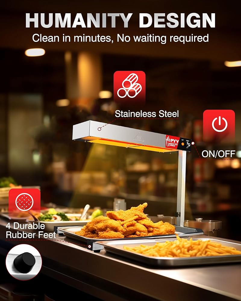 تشغيل مريح: يتميز المصباح الحراري الخاص بنا بسطح أملس من الفولاذ المقاوم للصدأ، مما يجعل من السهل تنظيفه. يتميز المفتاح بتصميم بسيط وفعال من حيث التكلفة للتشغيل. خفيف الوزن وسهل التجميع، يمكن تحريك هذا المصباح بسهولة. تضمن القاعدة على شكل حرف U مع 4 أقدام مطاطية الثبات، ويمكنها استيعاب صواني الطعام من أي حجم.