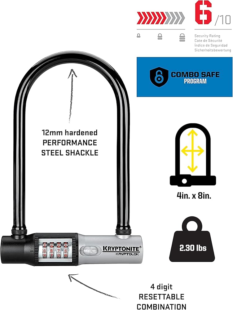 The Kryptonite Kryptolok Combo U-Lock features a 12mm hardened high grade carbon alloy steel shackle with a BentFoot design that resists bolt cutters and twisting leverage attacks. The lock uses a 4-digit resettable combination that is protected by a rotating dust cover. It has anti-rattle bumpers to reduce noise during transport. Rated at a 6 / 10 on our security scale, the Kryptolok Combo U-Lock is good for quick stops in a metropolitan area, a couple hours in the suburbs, or all day & overnight in rural areas. It also includes our patented side mount, Snap-In Bracket providing convenient multi-location U-Lock transport. The combination of these great features and our support programs including Combo Safe, Anti-Theft Protection, and Lifetime Warranty make Kryptonite Bicycle Locks the best choice for protecting what you value.