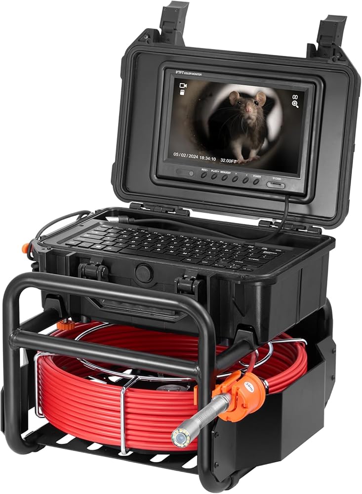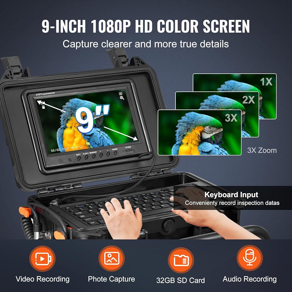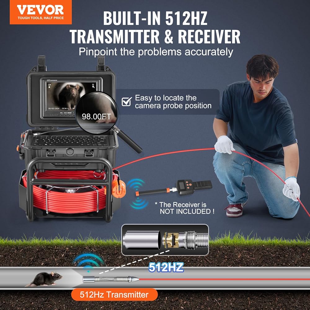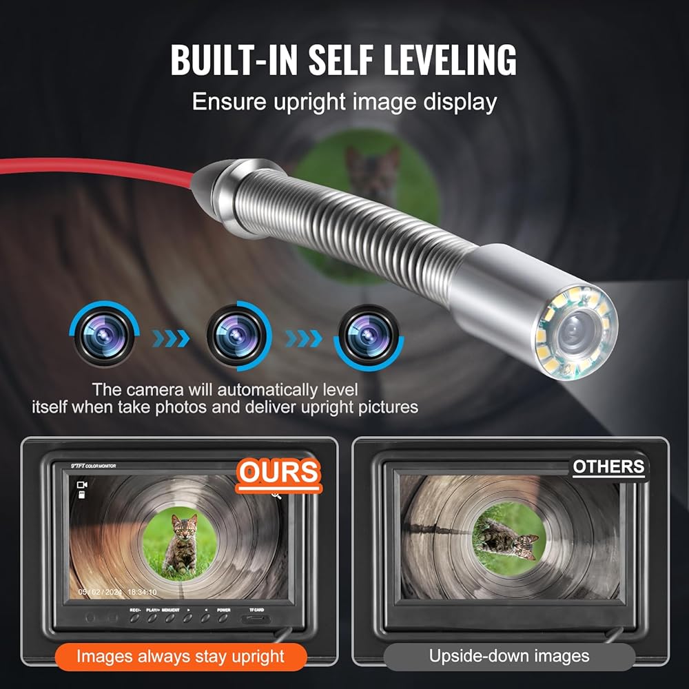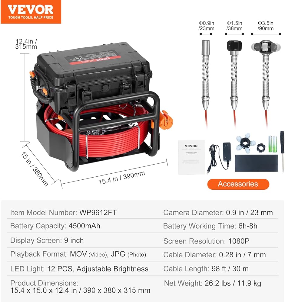 كاميرا VEVOR Sewer، 98 قدمًا / 30 مترًا، كاميرا تصريف ذاتية التسوية مع جهاز إرسال 512 هرتز، عداد مسافة، شاشة 9 بوصة 1080 بكسل HD كاميرا سباكة ثعبان مع ضوء 12 LED وبطاقة 32 جيجابايت لأنبوب مجاري الهواء