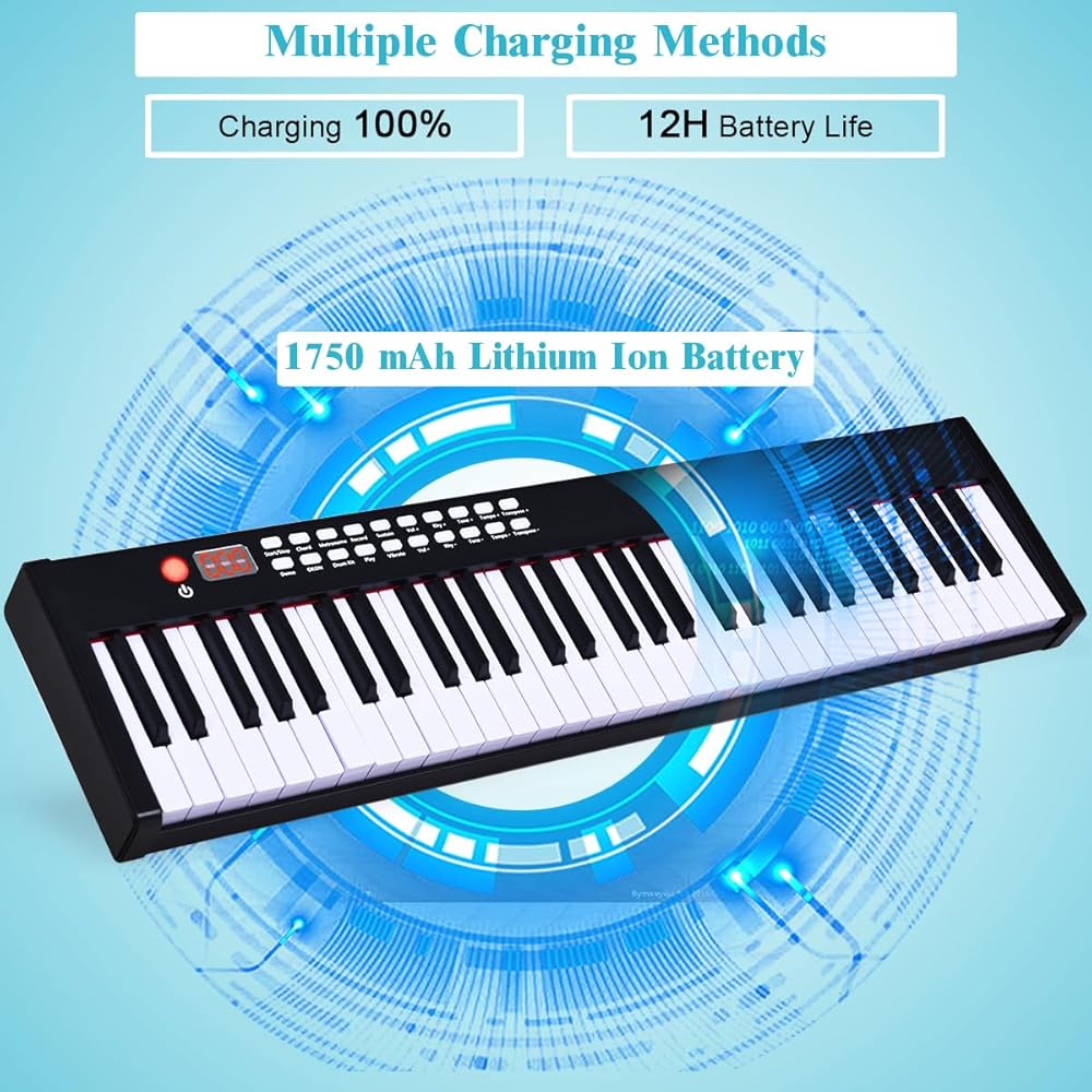 Unlock your musical potential with this versatile 61-key digital piano and immerse yourself in the realistic feel of the full-size semi-weighted keys. Elevate your performance with the handy function keys, including recording, metronome, sustain, and even an assortment of drum kits. Melt into the heavenly sound quality provided by the high-quality stereo speakers, offering a truly captivating and immersive playing experience. Seamlessly connect wirelessly or via MIDI/USB to unleash the full potential of your musical genius on various compatible equipment. Feel the freedom as you transport this portable and lightweight masterpiece with the included carrying bag, allowing you to share your melodies wherever your heart desires. Powered by an enduring lithium battery, it grants you a dazzling 12 hours of playing time after just one full charge, making it the ideal companion for students and musicians on the move.