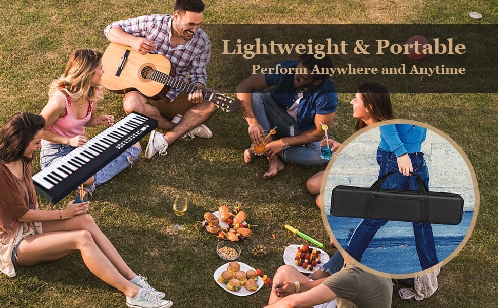 Portable Chargeable Piano: With a convenient carrying bag, it's a breeze the take this lightweight electric piano with you. And the lithium-battery powered piano supports 12 hours of playing after full charge. So it is a perfect choice for students attending lessons or musicians in band performance.